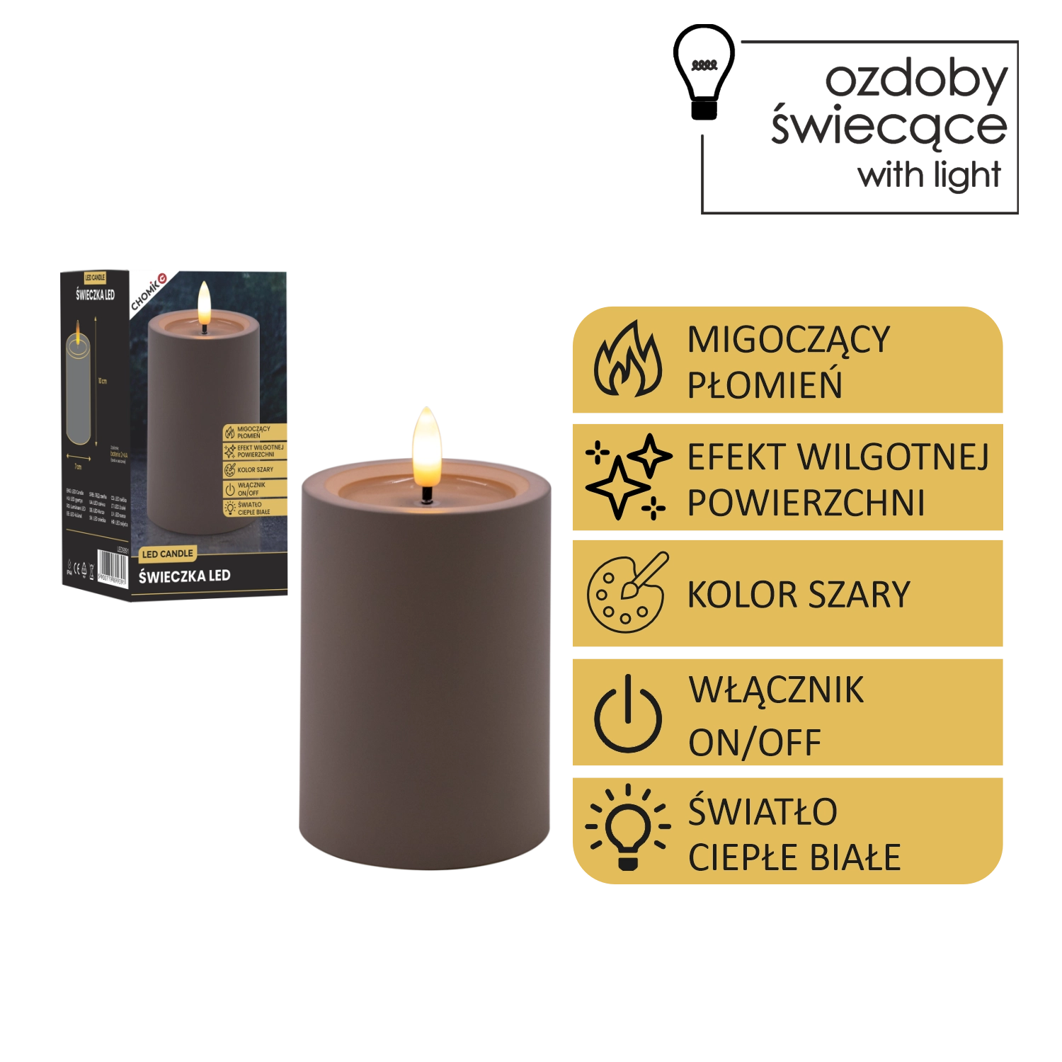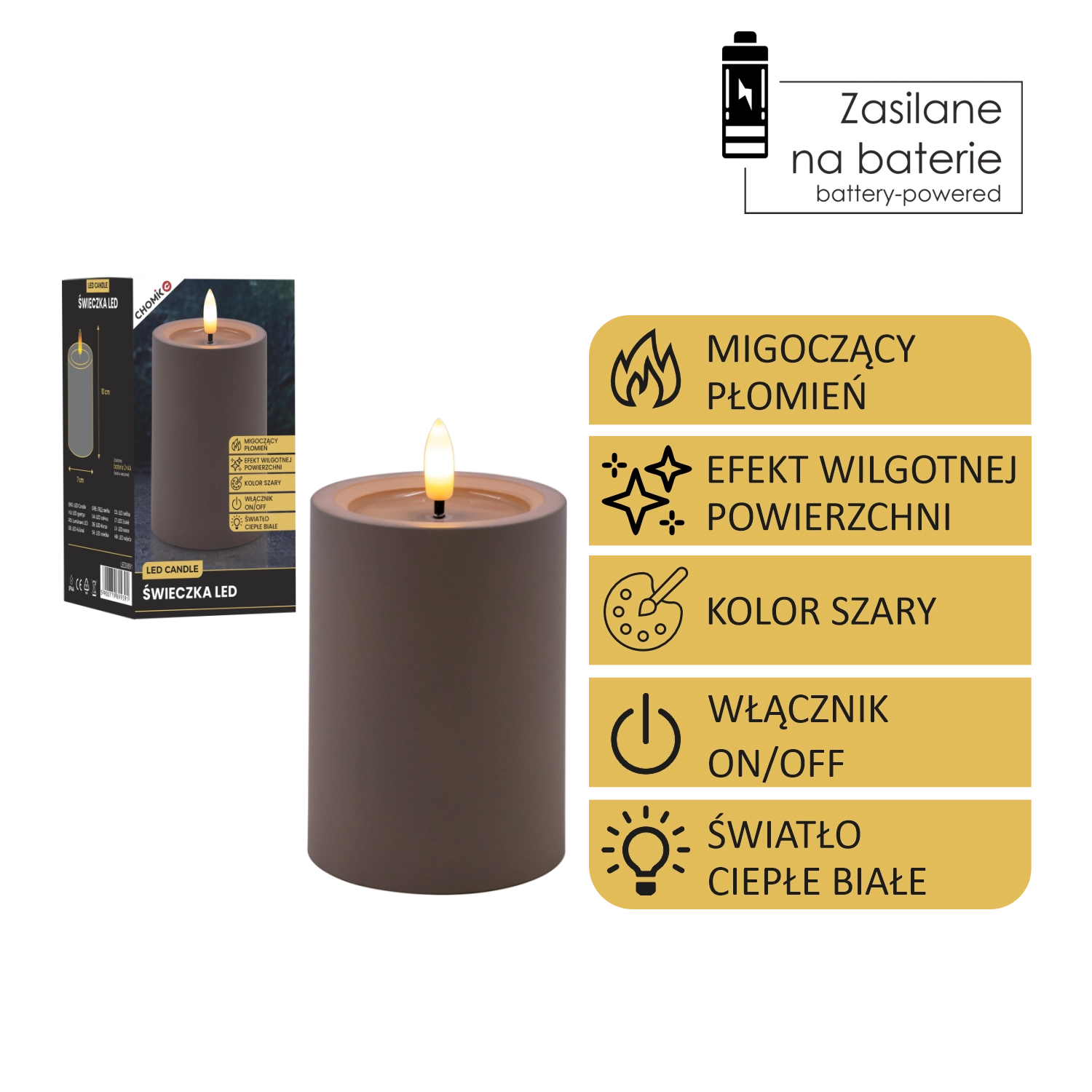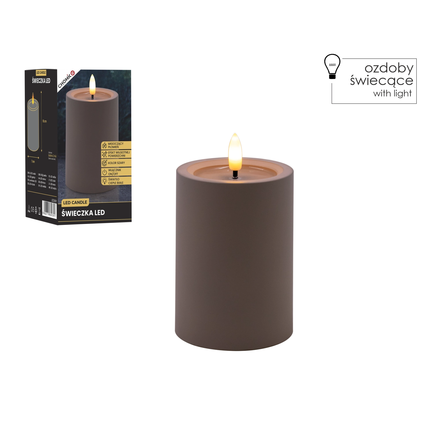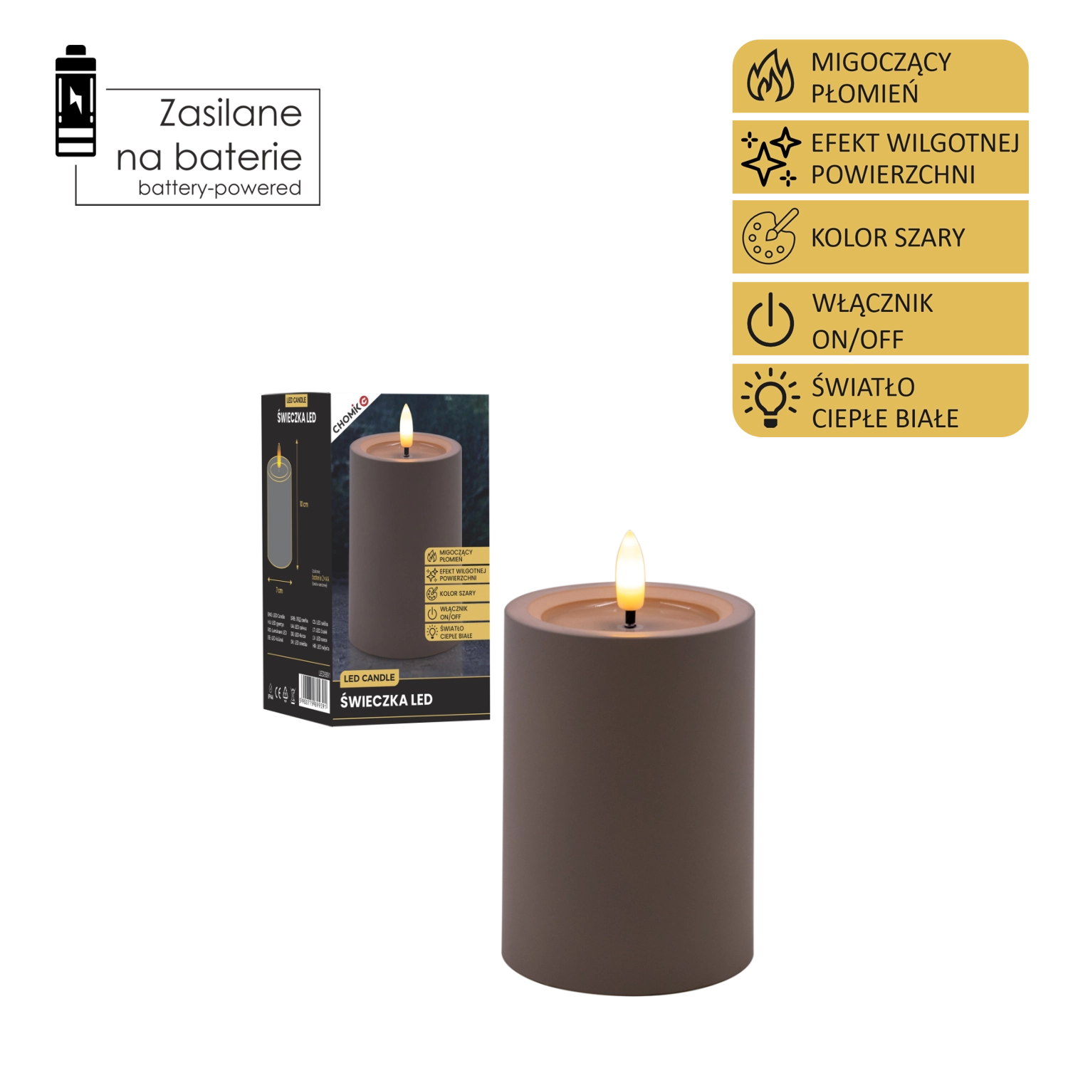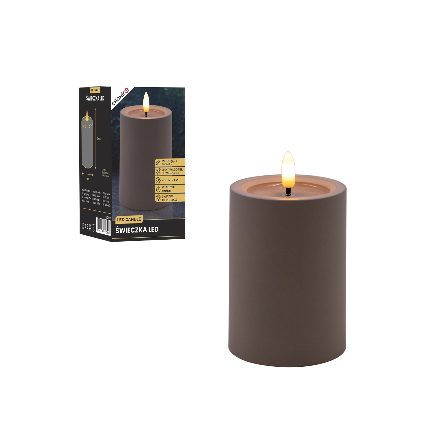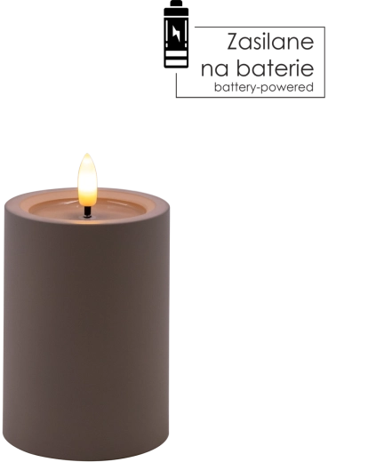 Cette bougie LED grise élégante de 7 × 10 cm crée une atmosphère chaleureuse grâce à une flamme chaude vacillante et à un effet réaliste de surface supérieure humide. Parfaite pour le salon, la chambre ou une table de fête. Sûre et sans fumée, elle fonctionne avec 2× piles AA (non incluses) et un simple interrupteur On/Off.