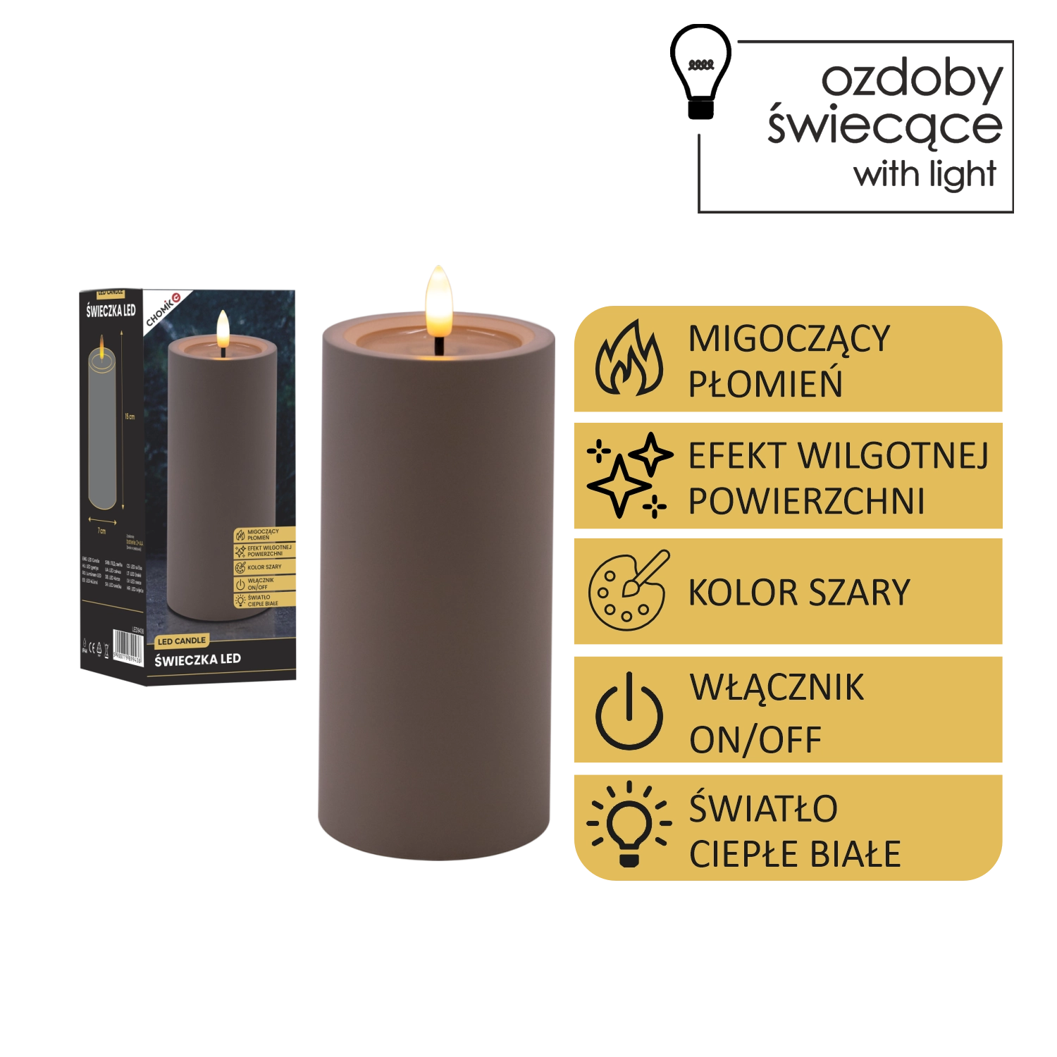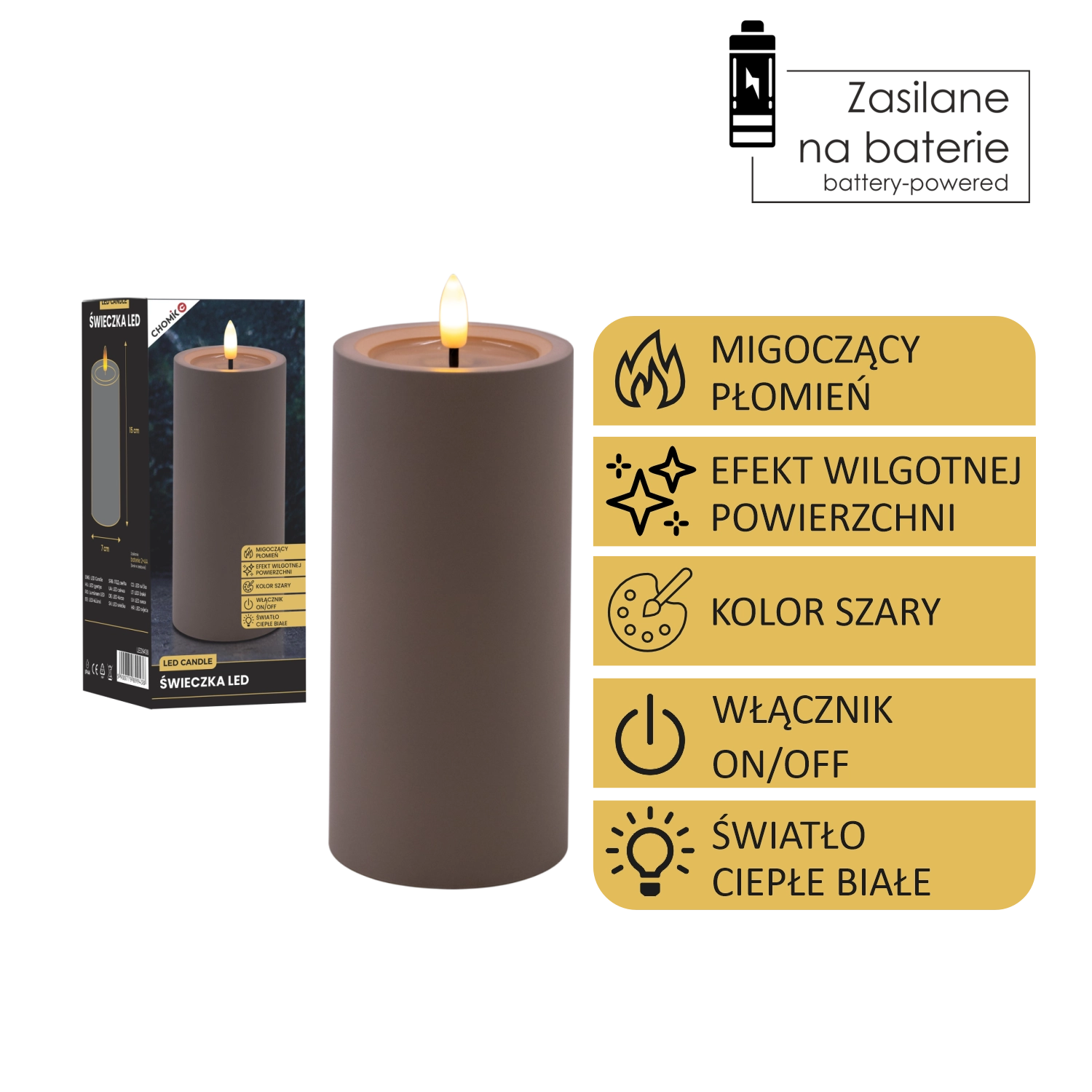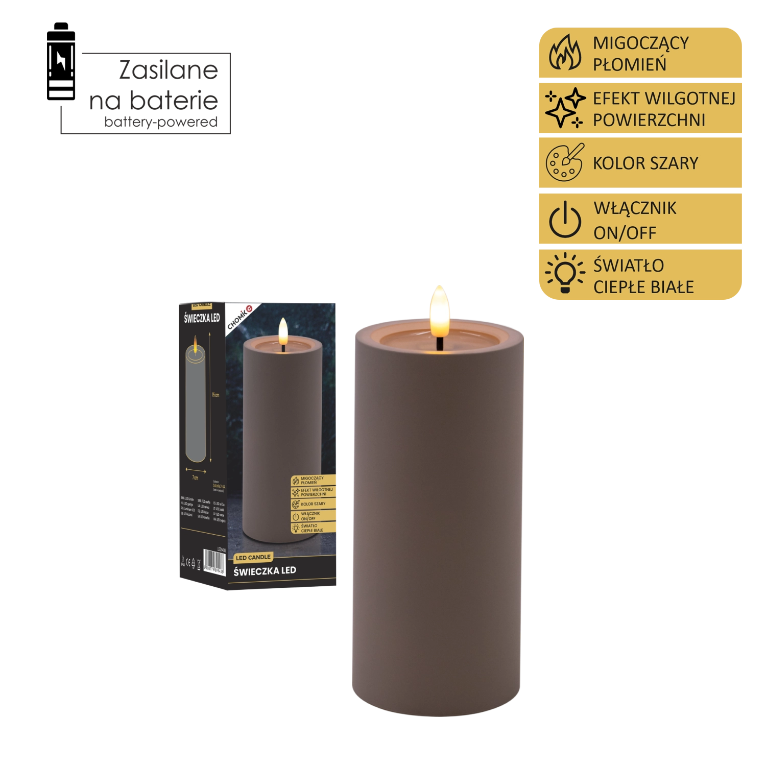 Cette bougie LED grise apporte un éclairage sûr et élégant à toute pièce. Grâce à sa lumière blanc chaud et à son effet de flamme vacillante, elle imite fidèlement une véritable bougie, tandis que l’effet de surface supérieure humide renforce son aspect authentique.