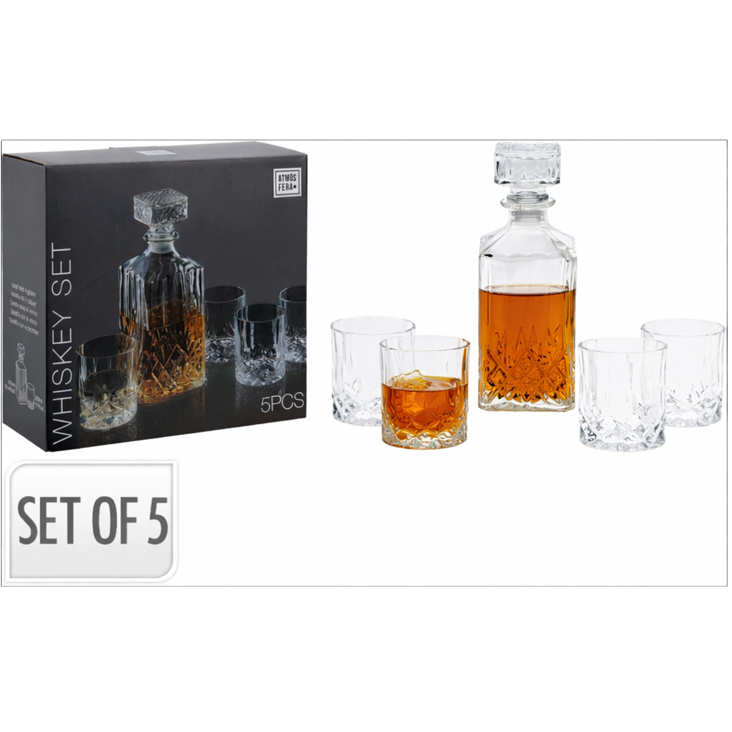 Ce set représentatif comprend une carafe de 900 ml et quatre verres de 230 ml. Le verre clair et épais avec relief décoratif ajoute du style au service de table et met en valeur les couleurs du whisky, du cognac ou du brandy. Grâce au bouchon en liège de la carafe, vos spiritueux préférés conservent leur arôme plus longtemps.