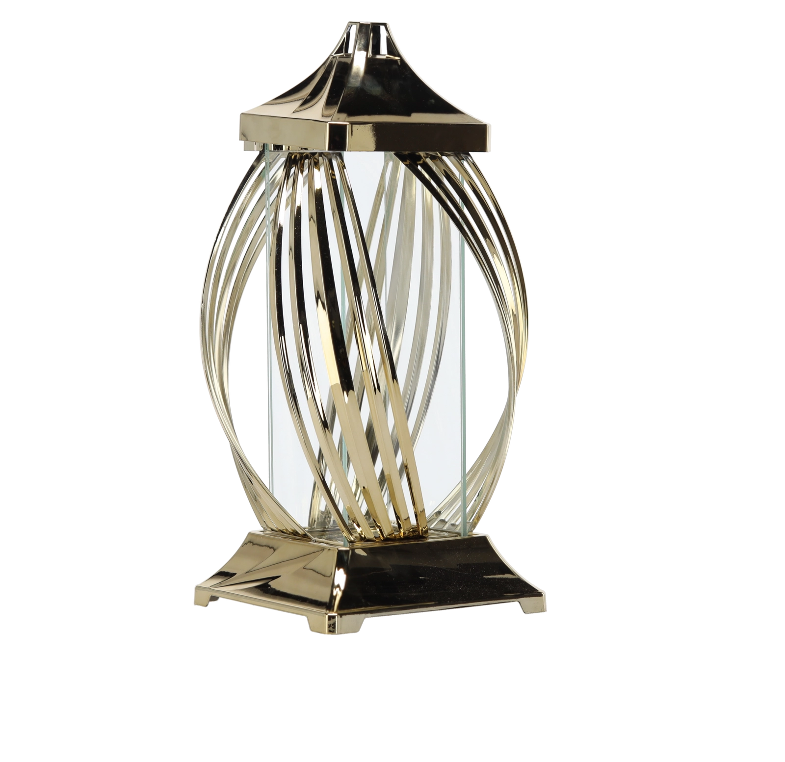 Cette lanterne décorative en métal séduit par son motif ruban moderne et sa surface métallique brillante. Les parois transparentes laissent passer la lumière d’une bougie ou d’un éclairage LED et créent une ambiance chaleureuse et élégante. La structure robuste avec base carrée assure une bonne stabilité, tandis que la poignée supérieure permet un transport ou une suspension aisés.
