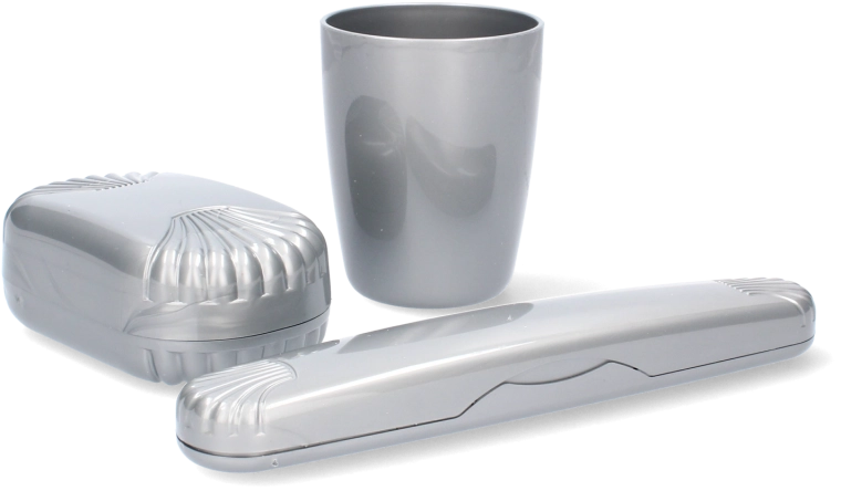 Le coffret comprend trois accessoires essentiels : un gobelet, une boîte à savon et un étui pour brosse à dents. Chaque élément est conçu pour résister aux conditions de voyage les plus exigeantes tout en occupant un minimum d’espace. L’emballage en film plastique facilite le transport et le rangement.