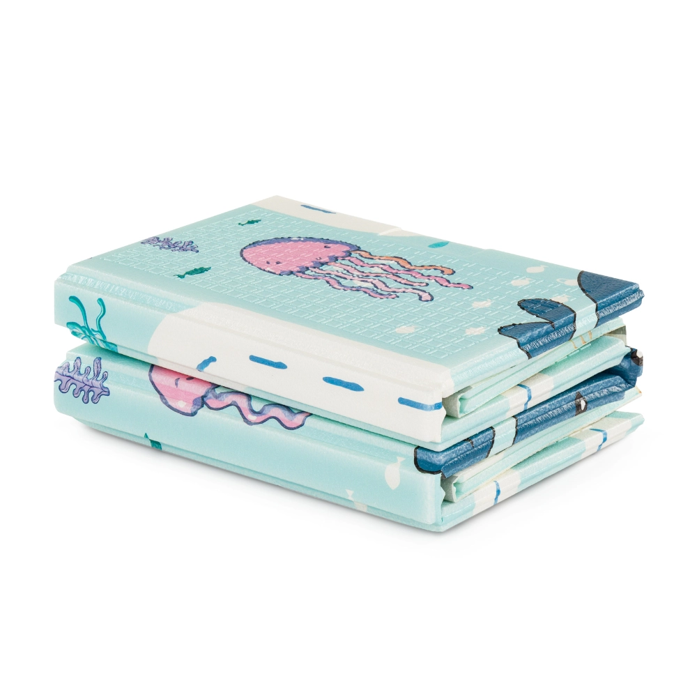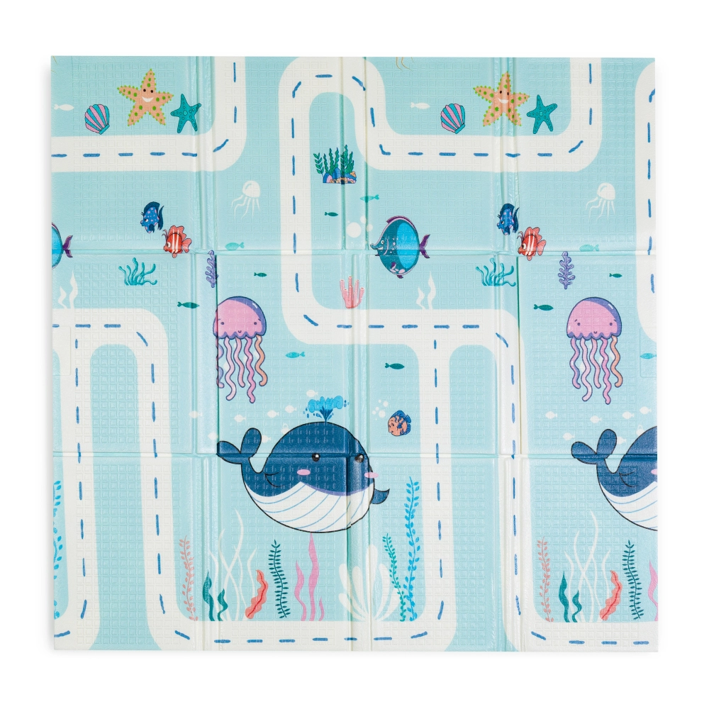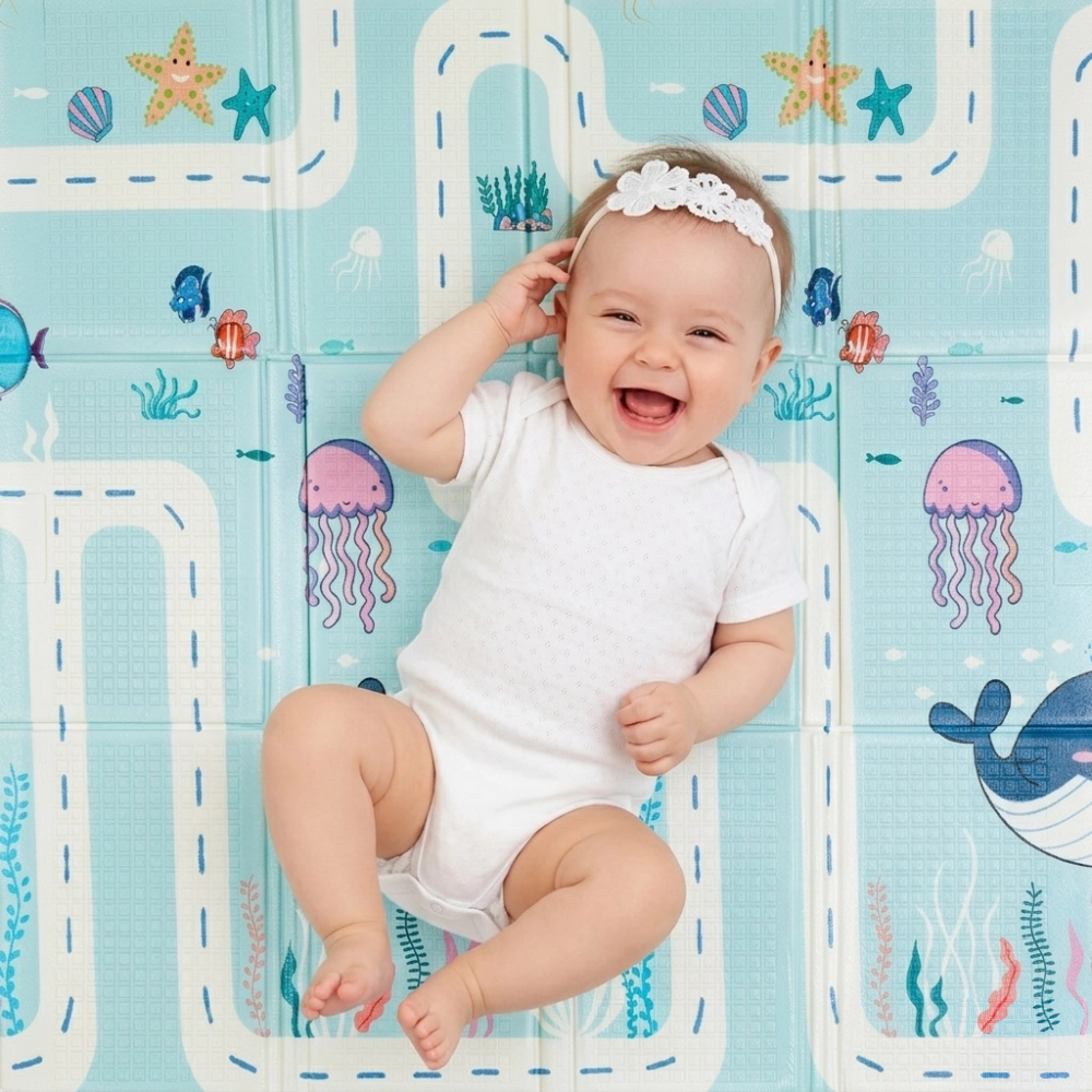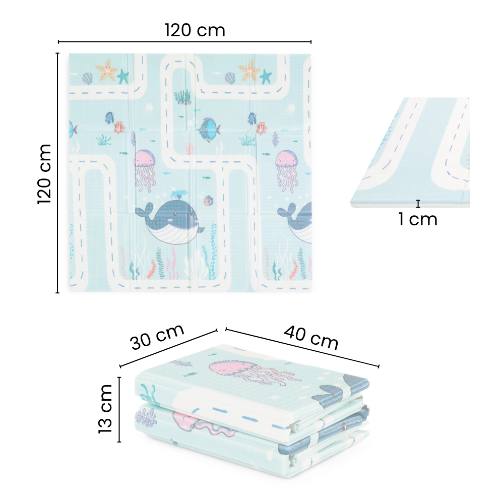 Tapis de jeu pliable et réversible en mousse XPE non toxique offrant une surface douce et sûre pour jouer dès la naissance. Il est antidérapant, imperméable, facile à nettoyer et assure une excellente isolation contre le froid et les saletés. Grâce à son faible poids et à son pliage rapide, vous le transportez facilement dans le sac pratique fourni – idéal à la maison comme au jardin.