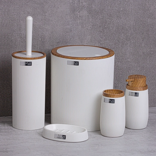 Ensemble de salle de bain élégant de cinq pièces en blanc avec de subtils éléments imitation bois, en plastique résistant pour un usage quotidien. Il comprend tout le nécessaire pour une salle de bain organisée et hygiénique : poubelle, brosse WC, distributeur de savon, gobelet pour brosses à dents et porte-savon.