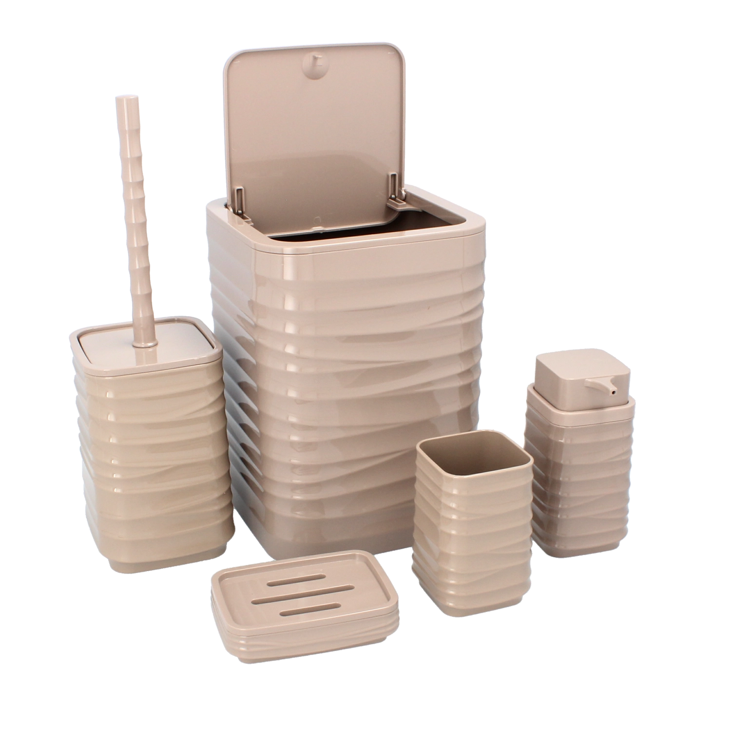 Un ensemble de salle de bain élégant en plastique résistant, dans une teinte marron raffinée, harmonise l’apparence de toute la salle de bain. Il comprend une poubelle, une brosse WC avec support, un distributeur de savon, un gobelet pour brosses à dents et un porte-savon. Son design carré rainuré, pratique, fait gagner de la place et se nettoie facilement.
