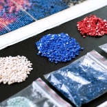 - toile avec couche adhésive, strass colorés, applicateur (stylet), coupelle en plastique, cire, légende/schéma