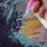 L’utilisation est simple : chargez l’extrémité de l’applicateur avec de la cire, choisissez la bonne couleur de strass selon le symbole et déposez-les sur la toile. Petit à petit, vous révélerez l’ensemble du motif en une mosaïque 3D/5D spectaculaire, brillante et captant la lumière.