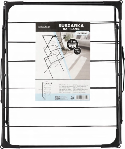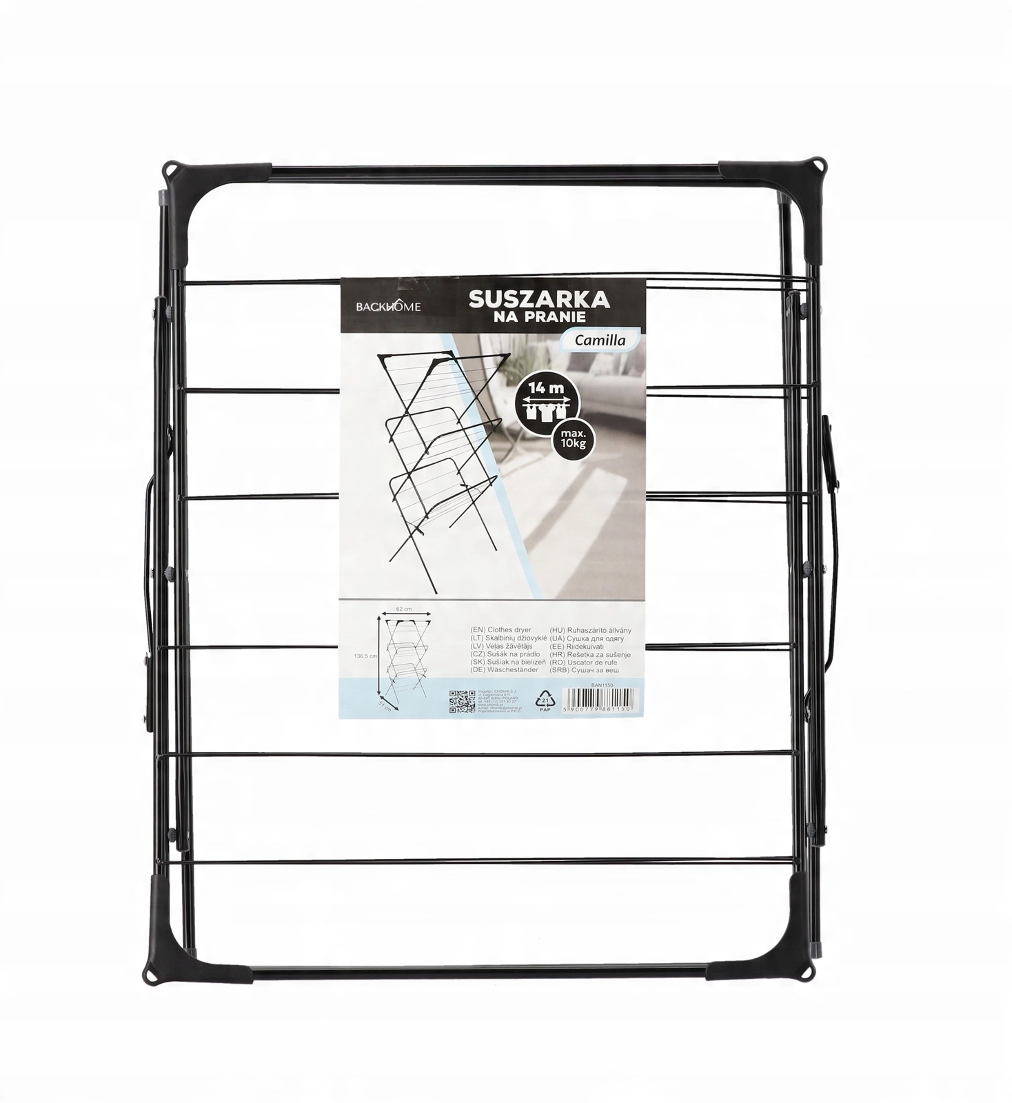L’étendoir à linge Camilla, dans une élégante couleur noire, associe une structure métallique durable à une disposition pratique des barres sur plusieurs niveaux. Avec une surface de séchage totale de 14 mètres, il accueille aisément une lessive standard tout en économisant de l’espace à la maison.