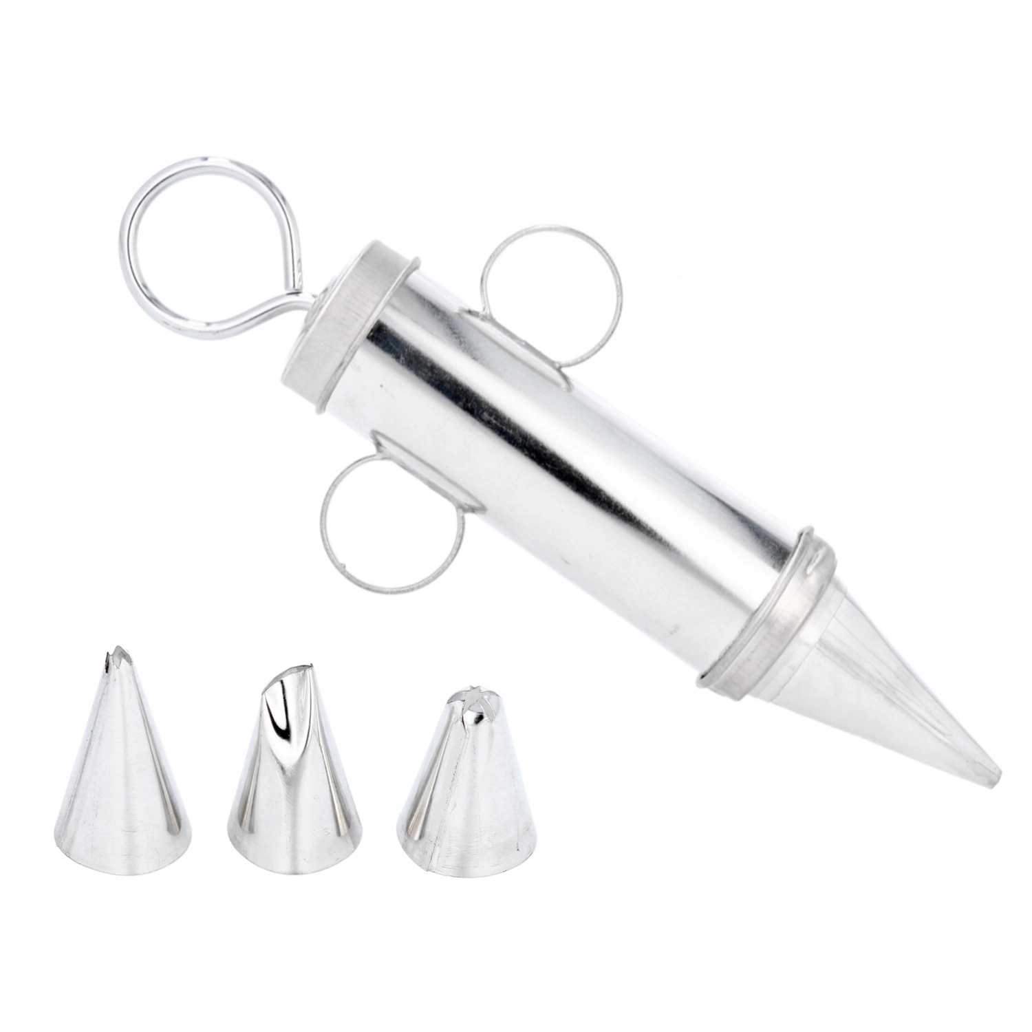 Décorateur pour gâteaux et pâtisseries, pratique et résistant, qui vous aide à obtenir un aspect professionnel aussi bien à la maison qu’en usage pro. Fabriqué en tôle galvanisée, compatible contact alimentaire, et grâce à 4 douilles interchangeables vous créez facilement divers motifs décoratifs.