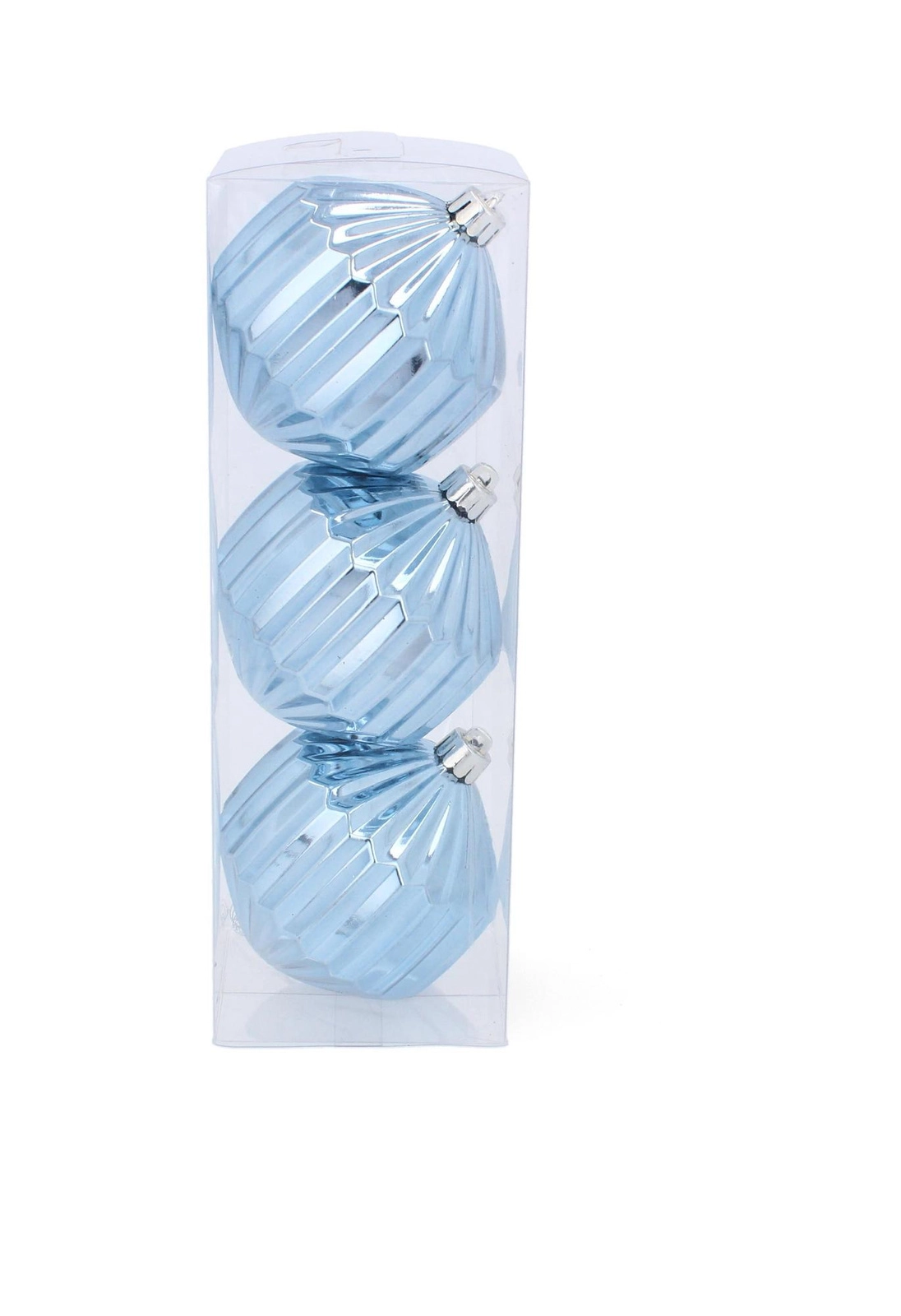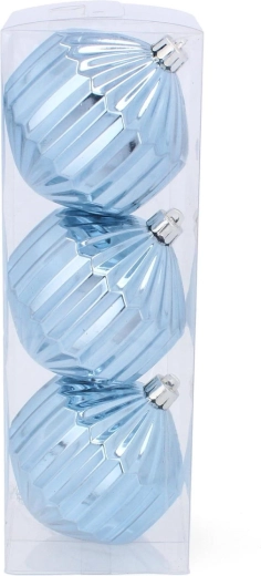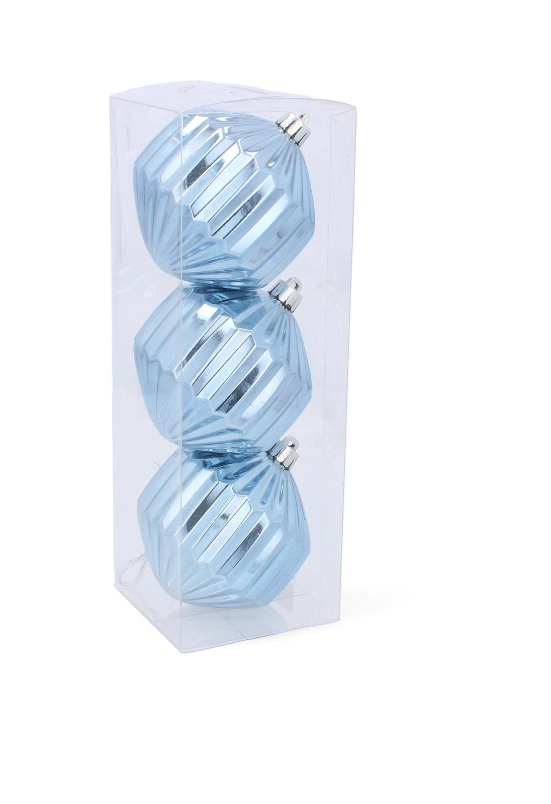 Le set de trois ornements dans une boîte transparente est prêt à être suspendu immédiatement et à être rangé en toute sécurité après la saison.