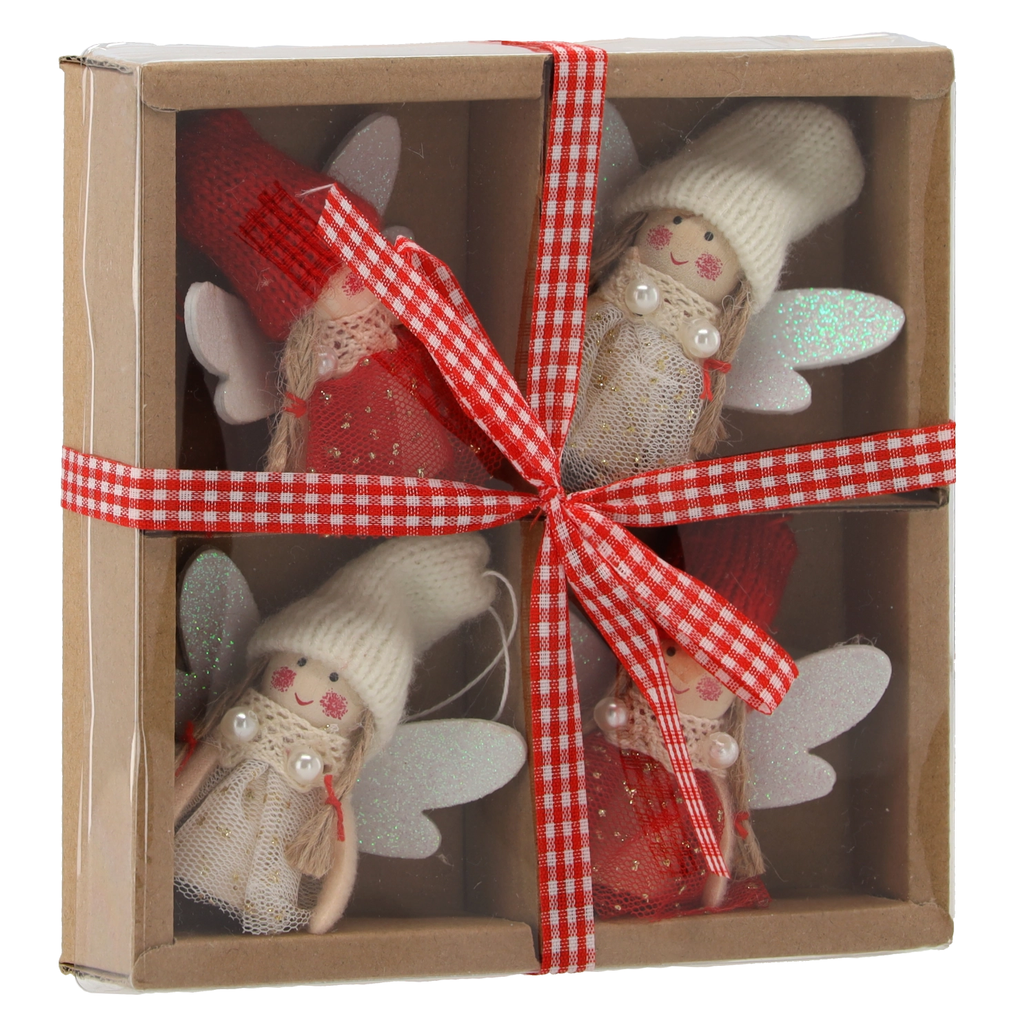 L’ensemble de quatre petits anges est présenté dans une boîte kraft avec fenêtre et ruban à carreaux – idéal comme cadeau de Noël prêt à offrir.
