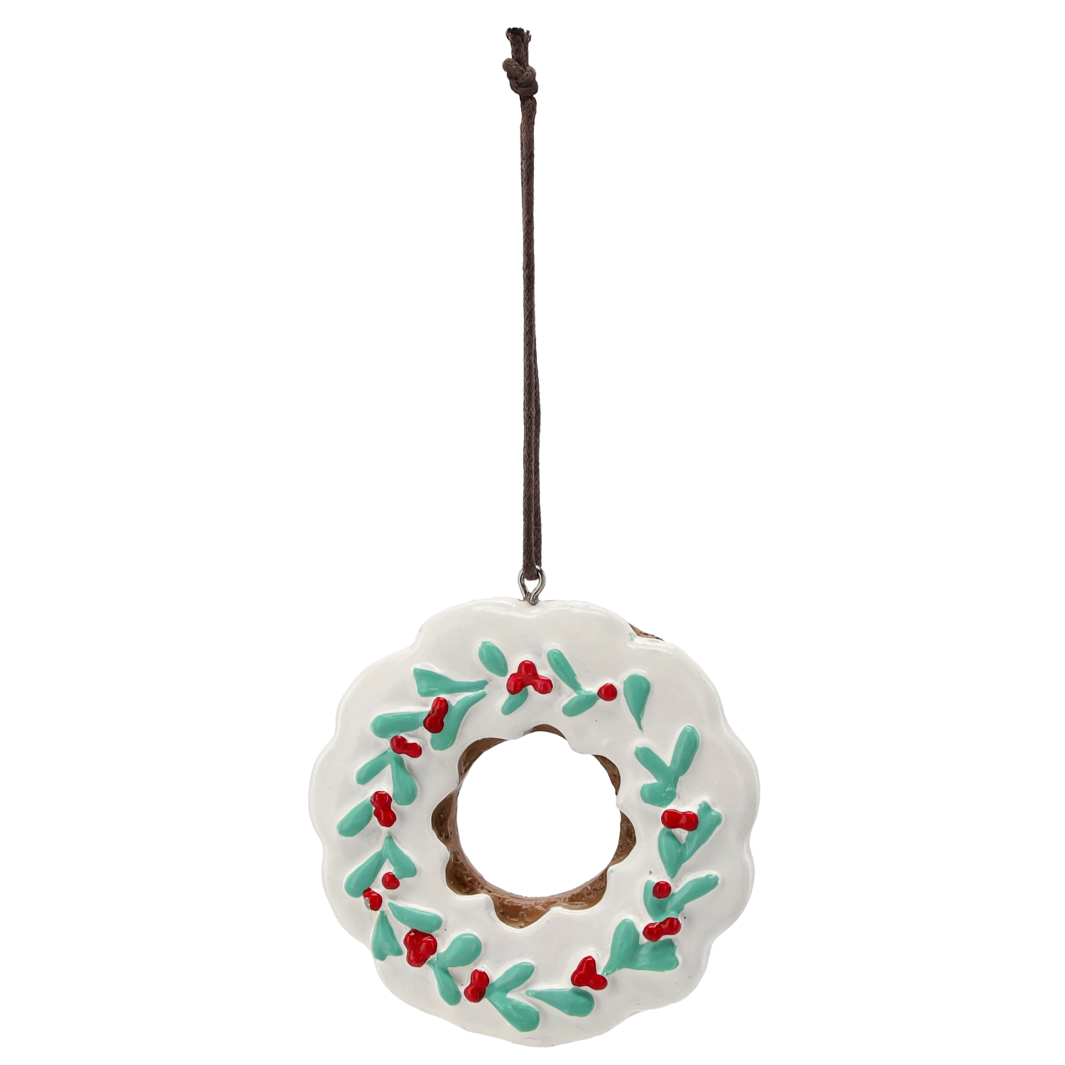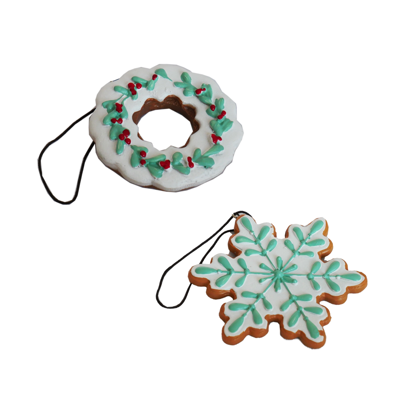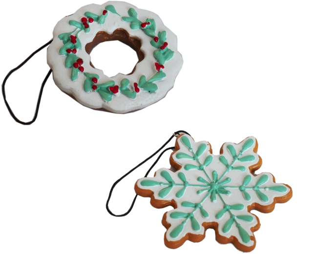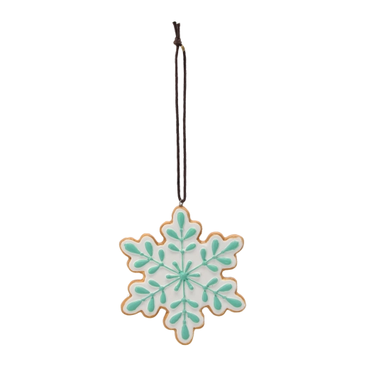 Ces décorations de Noël élégantes, inspirées de l’aspect des biscuits au pain d’épices, apportent une touche artisanale subtile à votre décoration. Les motifs suspendus flocon de neige et couronne avec glaçage blanc, rehaussés de feuilles vertes et de baies rouges, ressortent magnifiquement sur des aiguilles naturelles ou colorées. Grâce au ruban sombre, vous les accrocherez facilement aux branches, aux couronnes et aux crochets.
