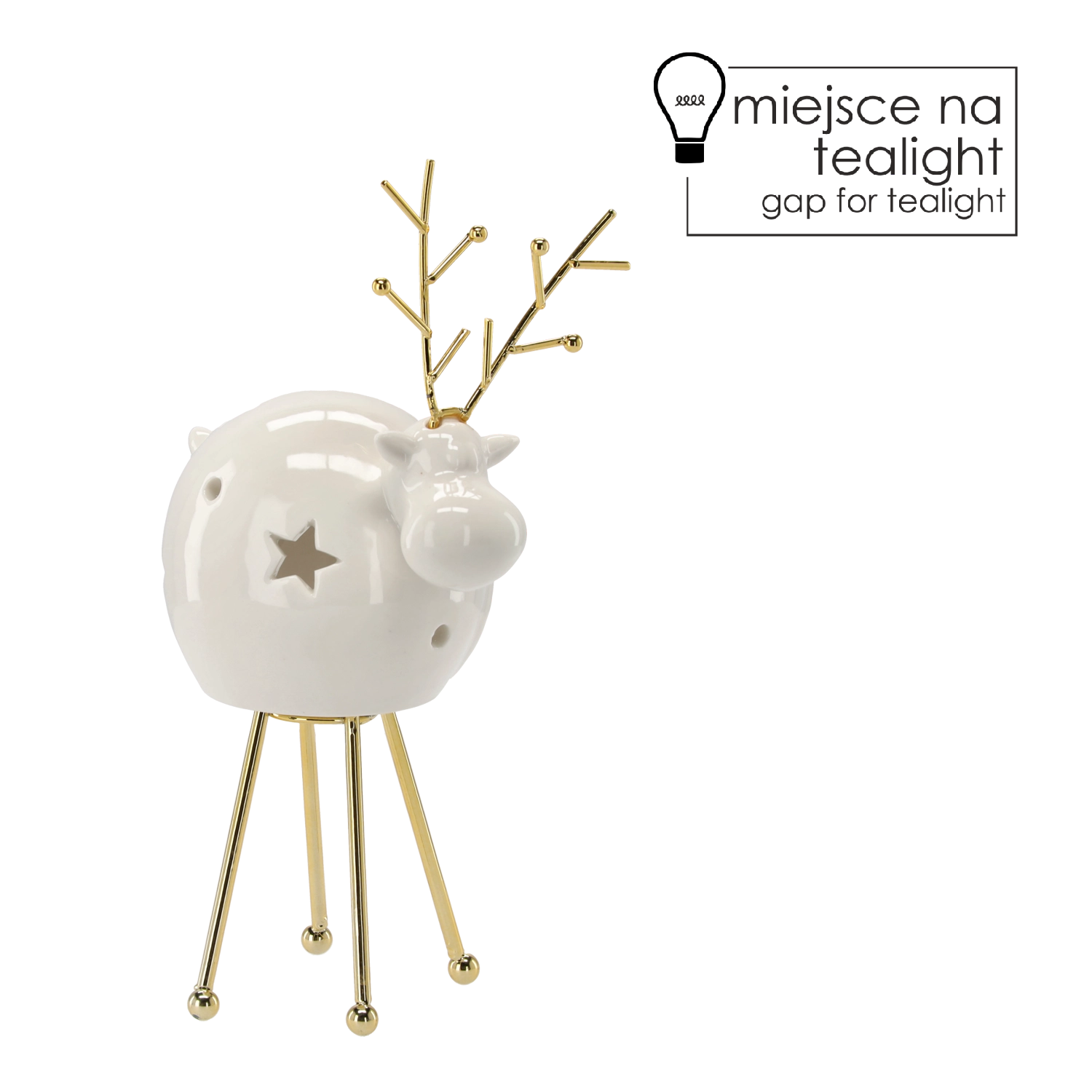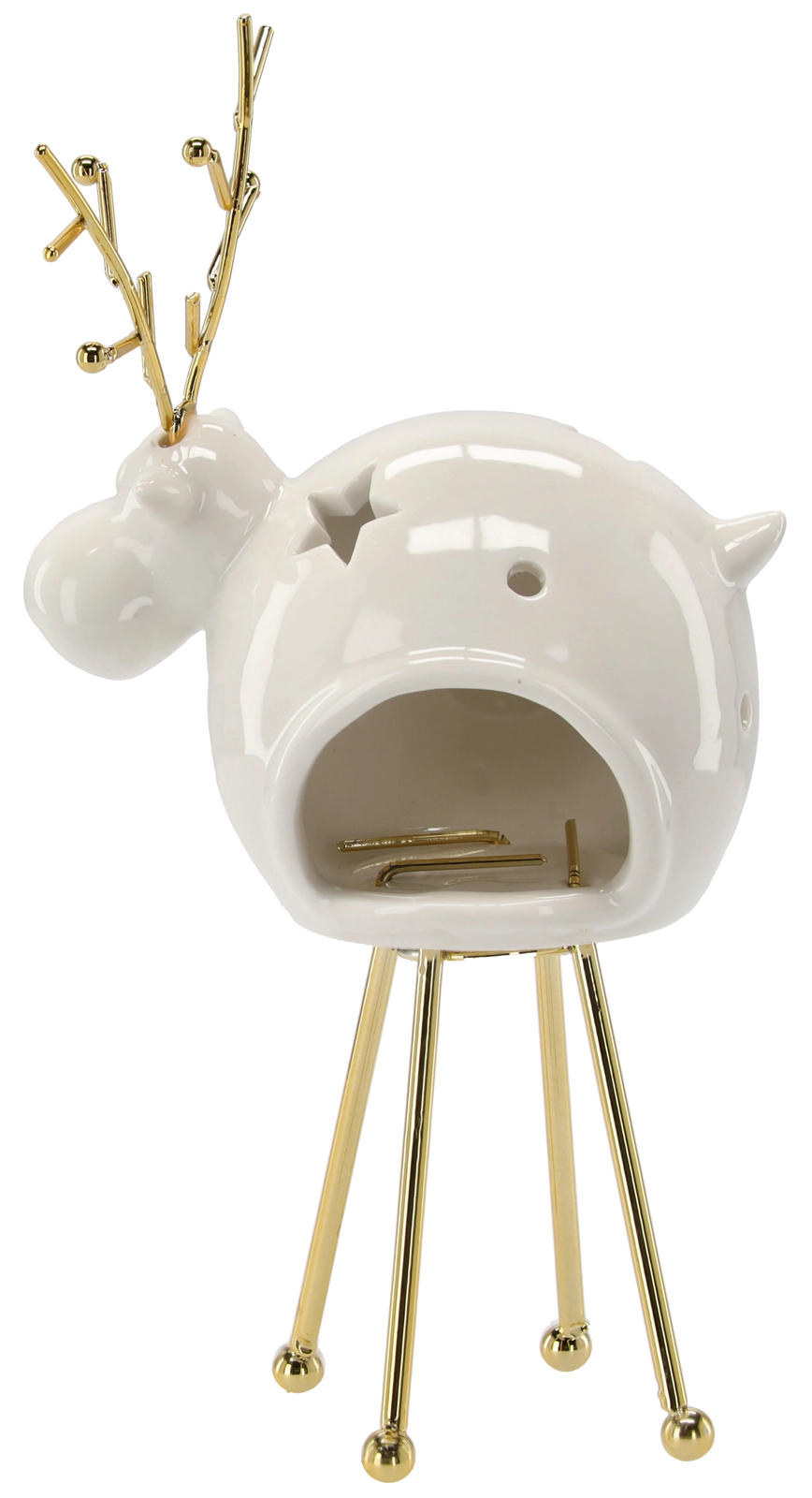 Ce bougeoir stylé en forme de renne combine un motif de Noël traditionnel avec une utilisation pratique. Sa fabrication métallique de qualité avec une finition dorée confère à la décoration un look à la fois moderne et festif, parfait pour peaufiner votre mise en scène de saison.