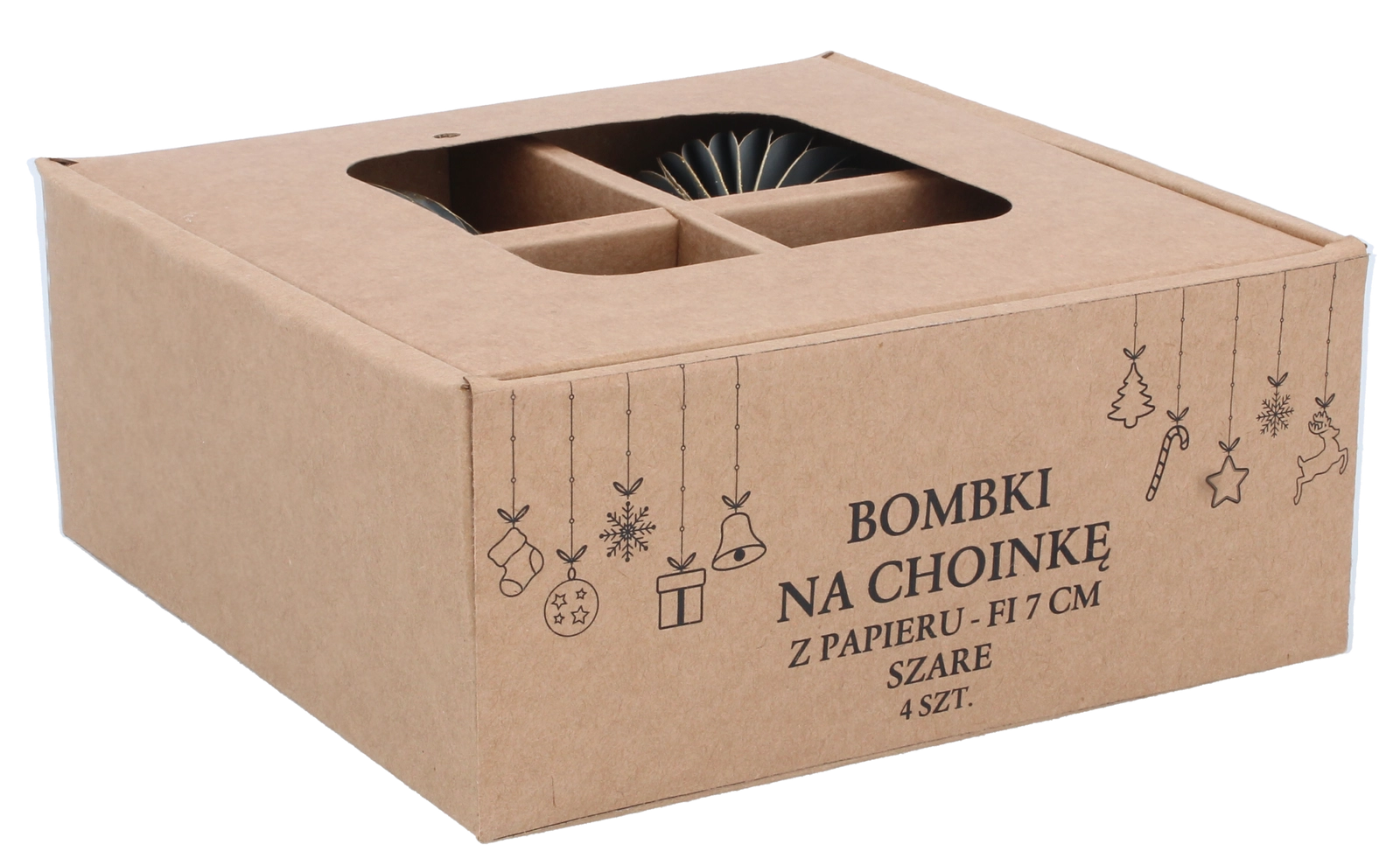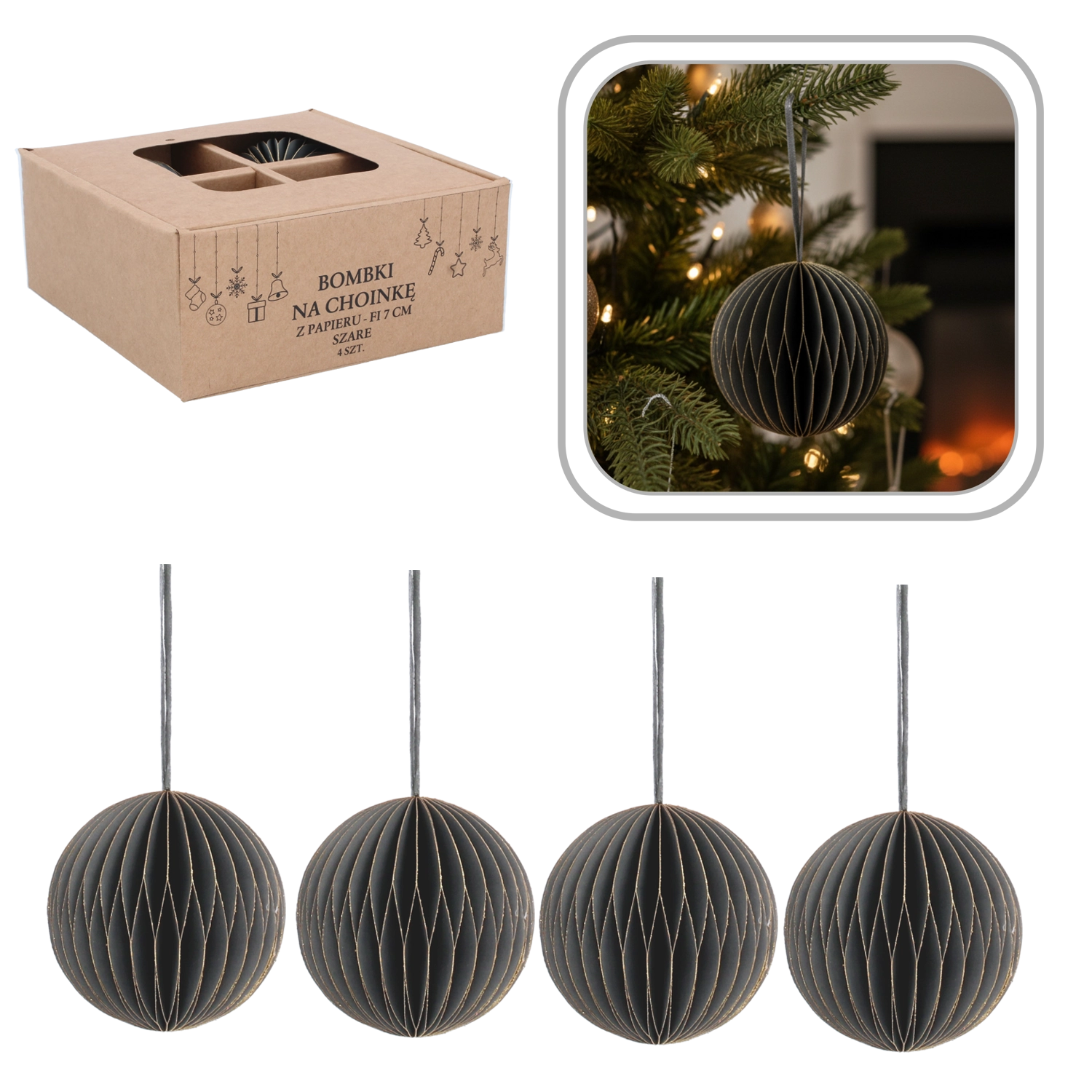 Un élégant lot de quatre décorations de Noël en papier de 7 cm de diamètre, en gris, apporte un complément moderne, harmonieux et sûr à votre décoration de fêtes. Elles sont légères, incassables et résistantes, avec des ficelles pour une suspension facile sur le sapin, les couronnes et les guirlandes. Leur design minimaliste se combine parfaitement avec d’autres décorations et confère à l’intérieur un look élégamment équilibré.
