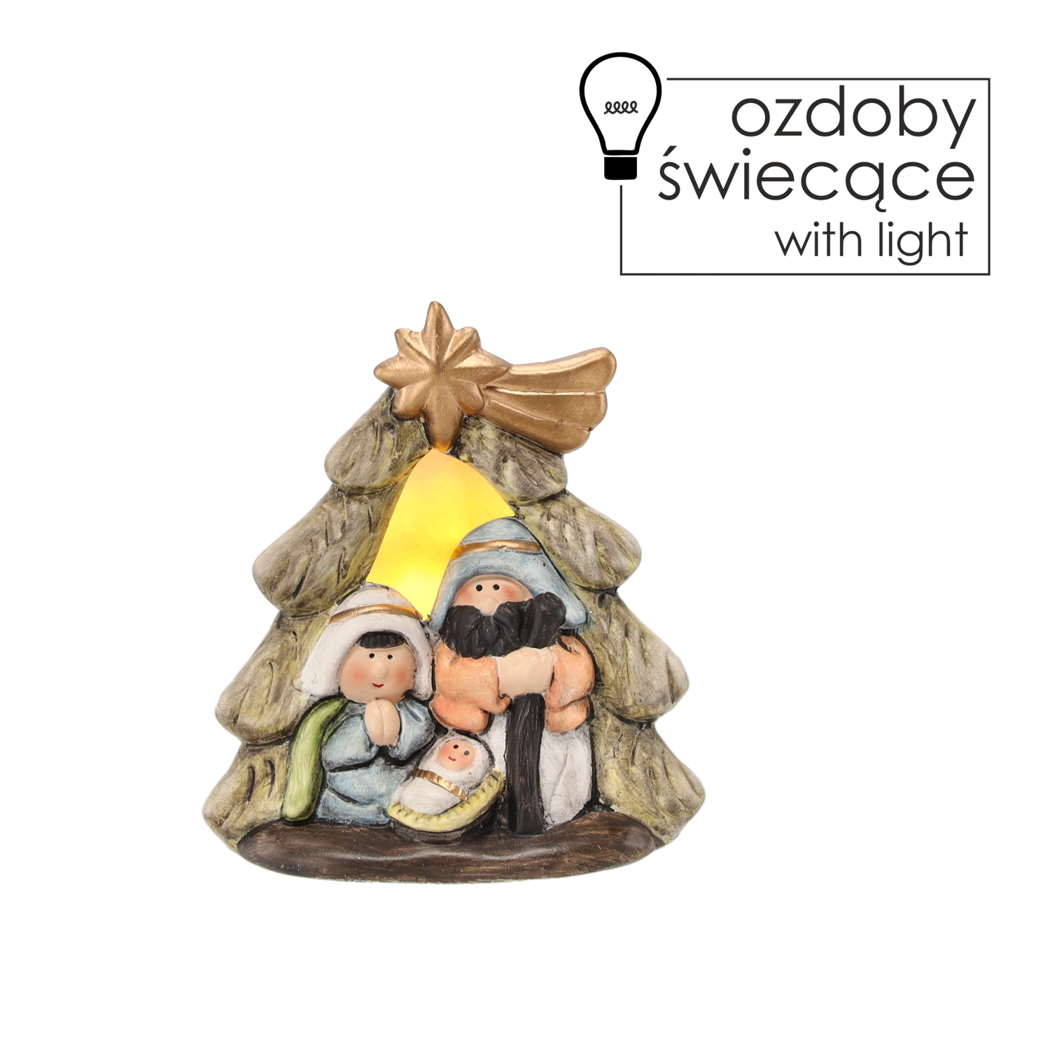 Élégante décoration de Noël en forme de sapin avec étoile de Bethléem dorée, apportant calme et lumière à votre intérieur. Le rétroéclairage LED à ton chaud intégré illumine délicatement la Sainte Famille et souligne la magie de Noël à la maison comme sur la table de fête.