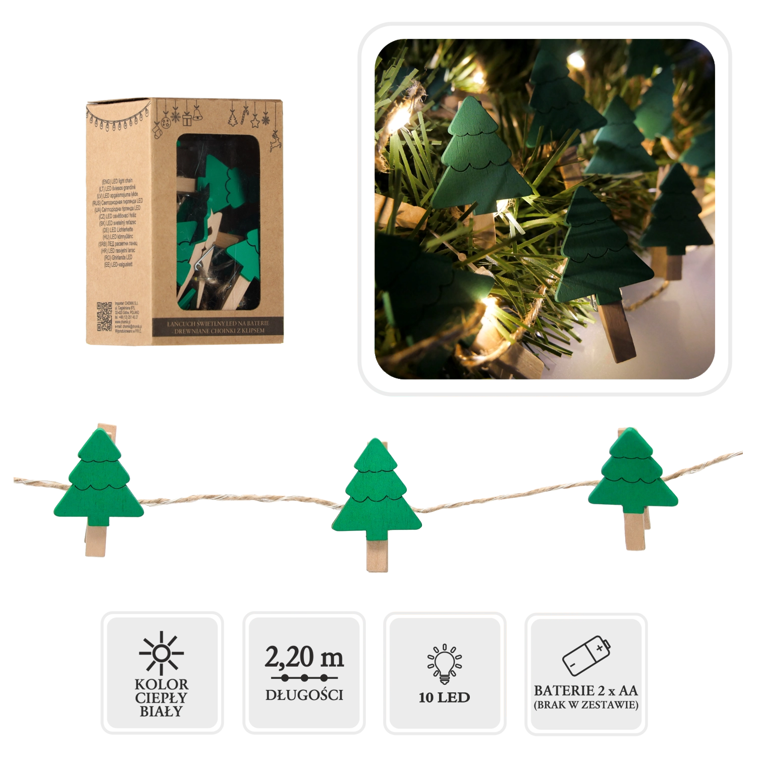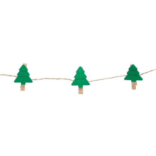 Cette guirlande LED décorative allie lumière et fonctionnalité. Grâce aux pinces en bois en forme de sapins de Noël, exposez aisément photos, cartes postales, étiquettes ou petites décorations. Les LED blanc chaud diffusent une lumière cosy qui souligne la magie de Noël dans le salon, la chambre d’enfant ou sur une table joliment dressée.