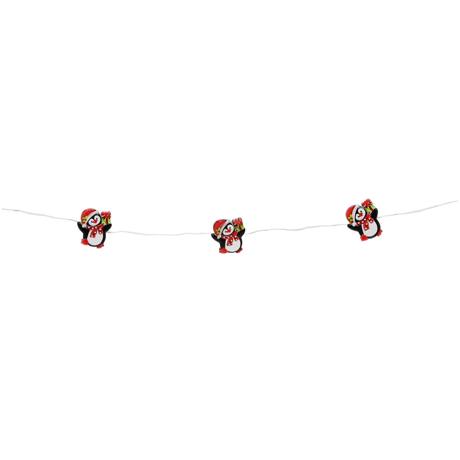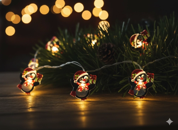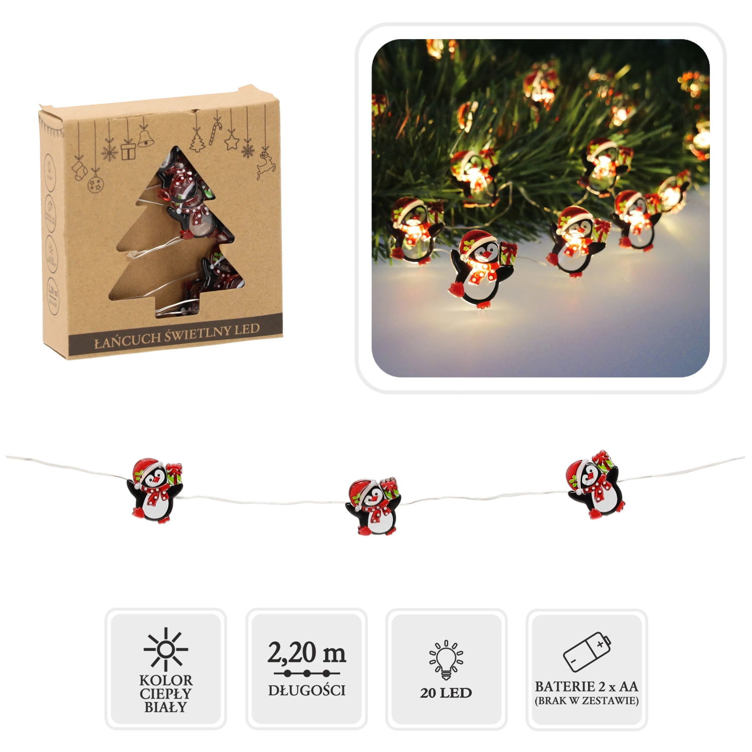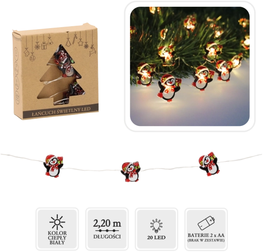 Adorable guirlande lumineuse à motif de pingouins qui apporte chez vous une lumière blanc chaud et une ambiance festive. Grâce à l’alimentation par 2× piles AA, vous pouvez l’installer partout sans câbles – sur une fenêtre, une étagère ou un petit sapin. Sa longueur totale de 2,2 m convient aux décorations de Noël comme à la chambre d’enfant.
