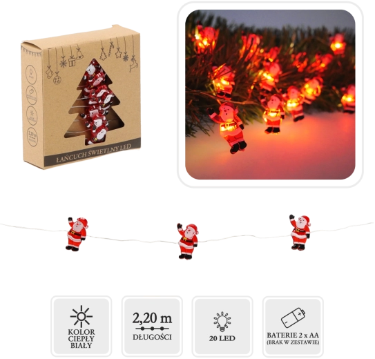 Illuminez votre intérieur avec une adorable guirlande de Noël avec PÈRE NOËL. 20 LED chaudes sur un fil transparent créent une ambiance festive et chaleureuse partout – sur le sapin, la fenêtre ou l’étagère. Grâce à l’alimentation par piles 2× AA, vous avez la liberté d’installation sans prise ni câbles. La lumière blanc chaud apporte une touche de magie et de joie à toute la famille.