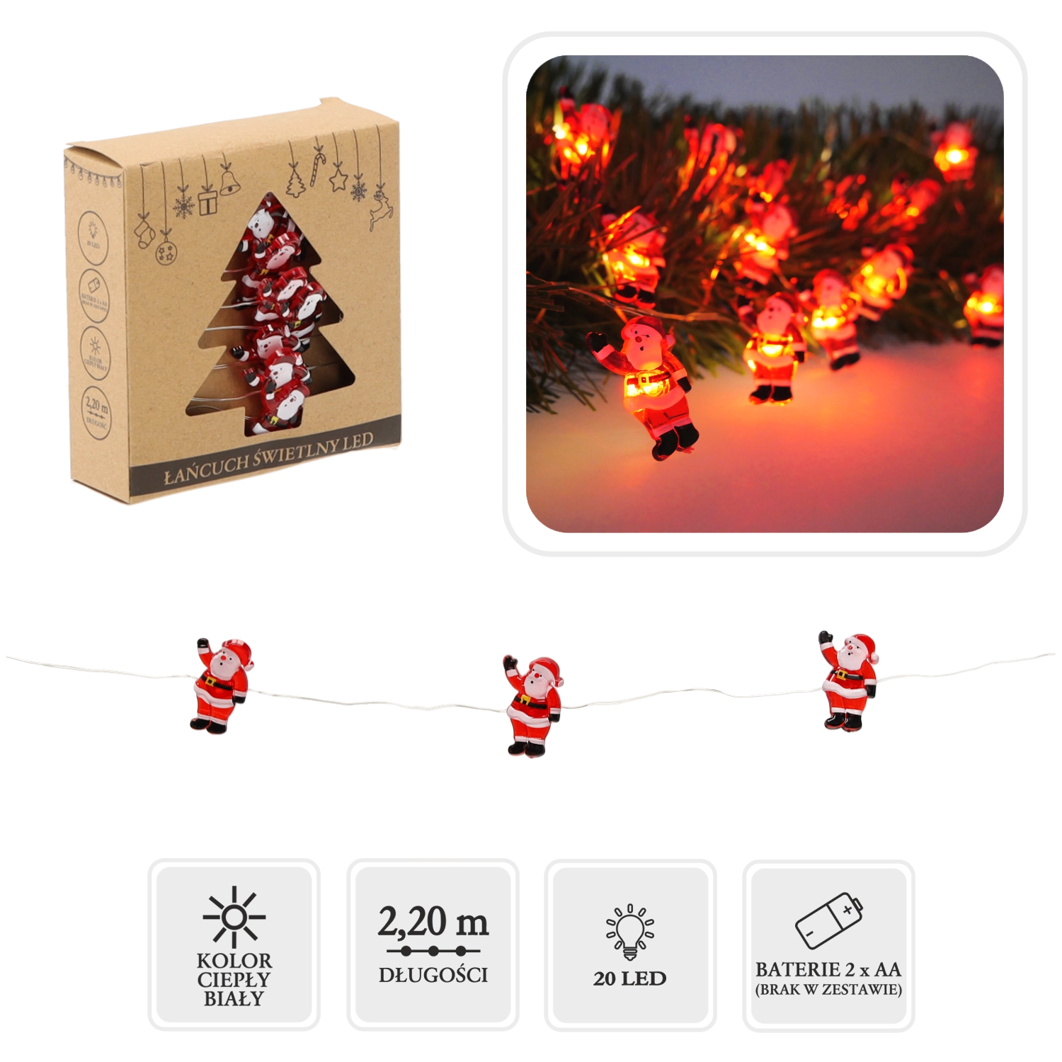La guirlande lumineuse de Noël avec PÈRE NOËL est une décoration ludique qui insuffle immédiatement une ambiance conviviale et chaleureuse à votre intérieur. Chaque LED est coiffée d’un adorable motif du Père Noël, parfait sur les branches du sapin, la cheminée ou dans la chambre des enfants.