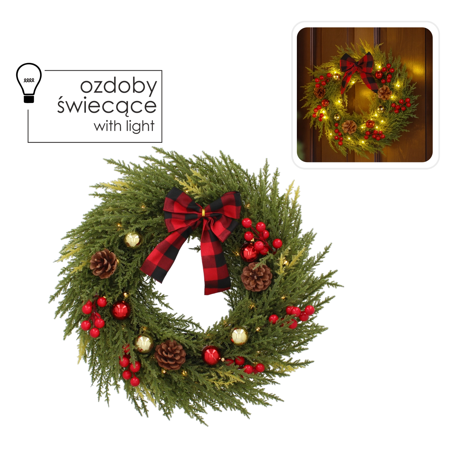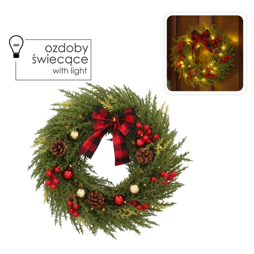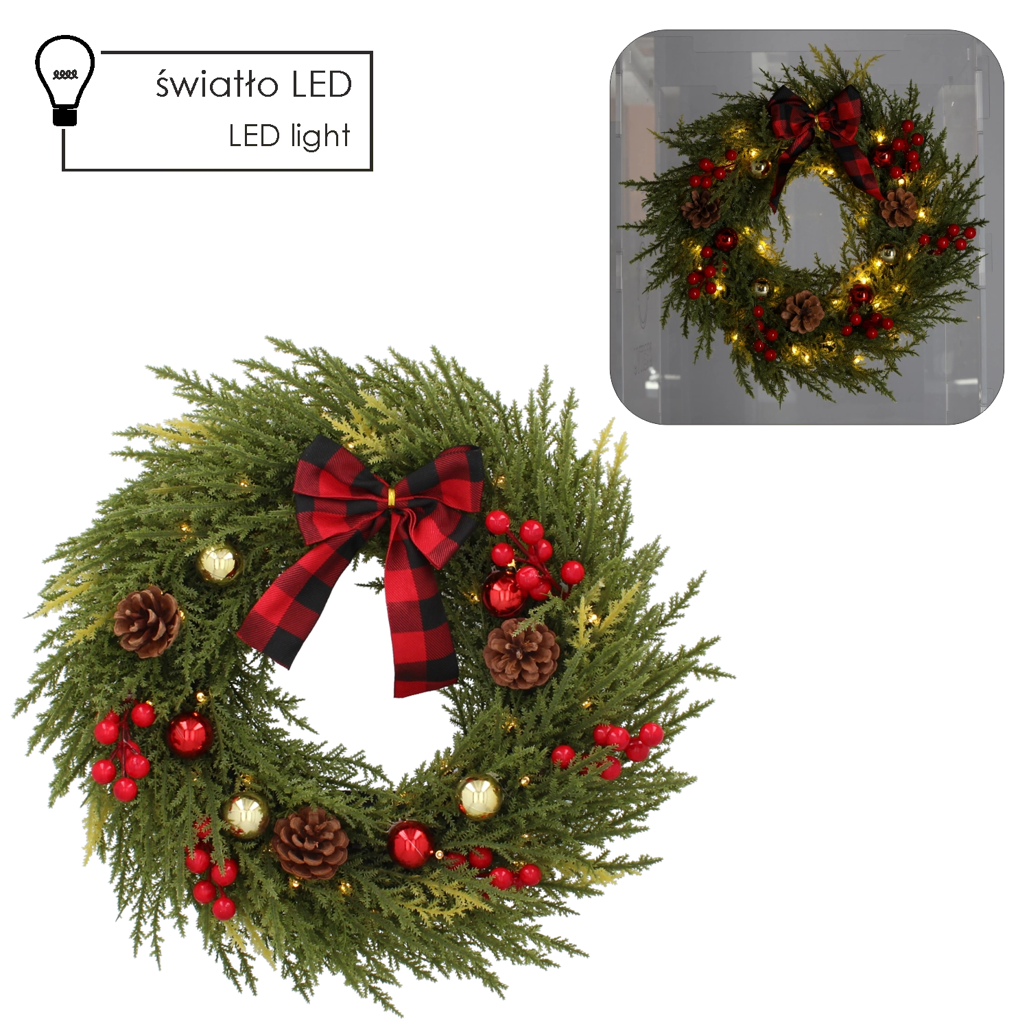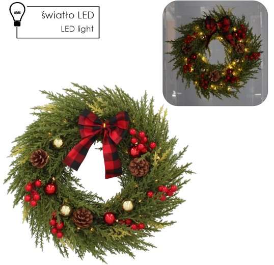 Cette élégante couronne de Noël LED apporte une ambiance chaleureuse à la maison grâce à sa lumière blanc chaud et à son feuillage dense et réaliste agrémenté d’éléments décoratifs comme des baies, des pommes de pin et un ruban écossais stylé. Alimentée par 3× AA, elle se fixe facilement sur une porte, un mur ou une fenêtre sans câbles visibles.