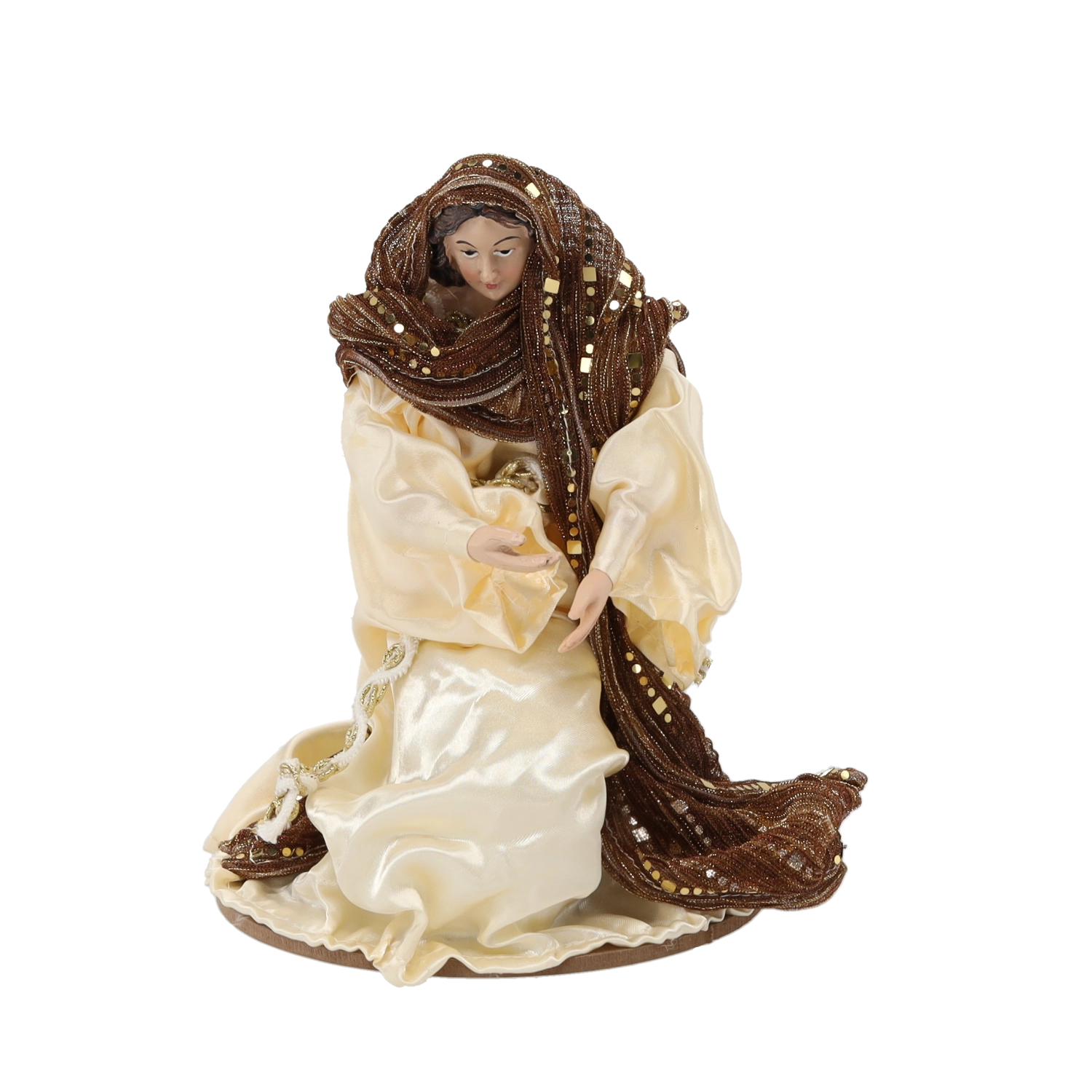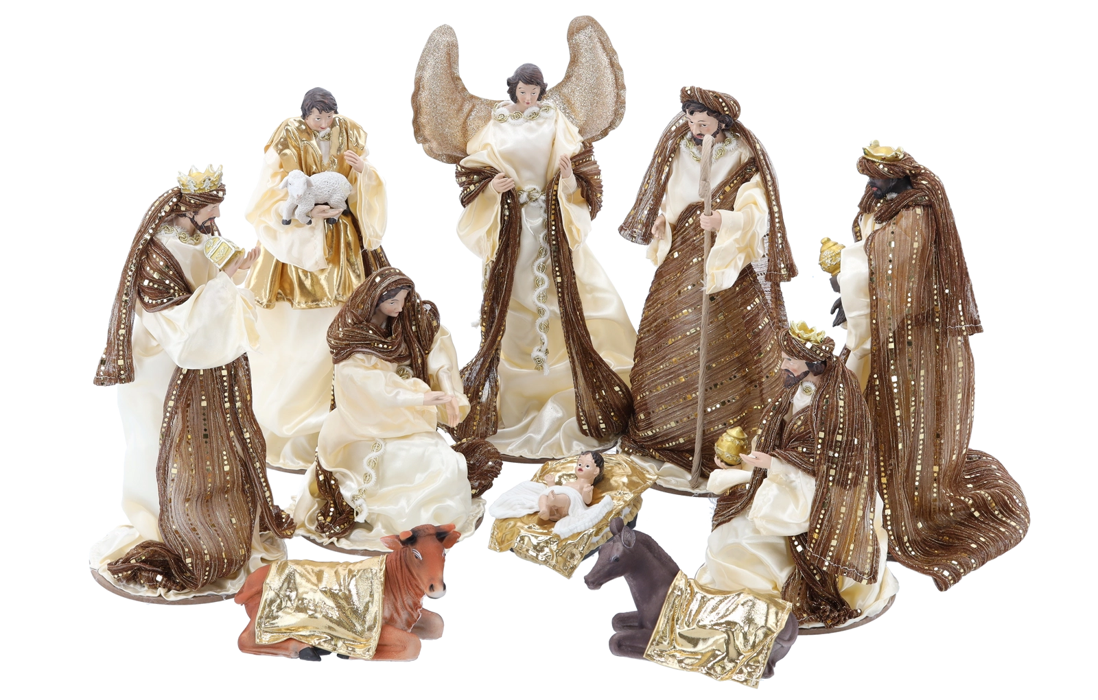 Ce set de crèche représentatif comprend la Sainte Famille, un ange, les trois rois, un berger et deux animaux. Les figurines aux tons crème et bruns avec des détails dorés offrent un rendu élégant et intemporel, s’intégrant aussi bien aux intérieurs classiques que modernes. Le matériau en résine garantit une longue durée de vie et une excellente stabilité.
