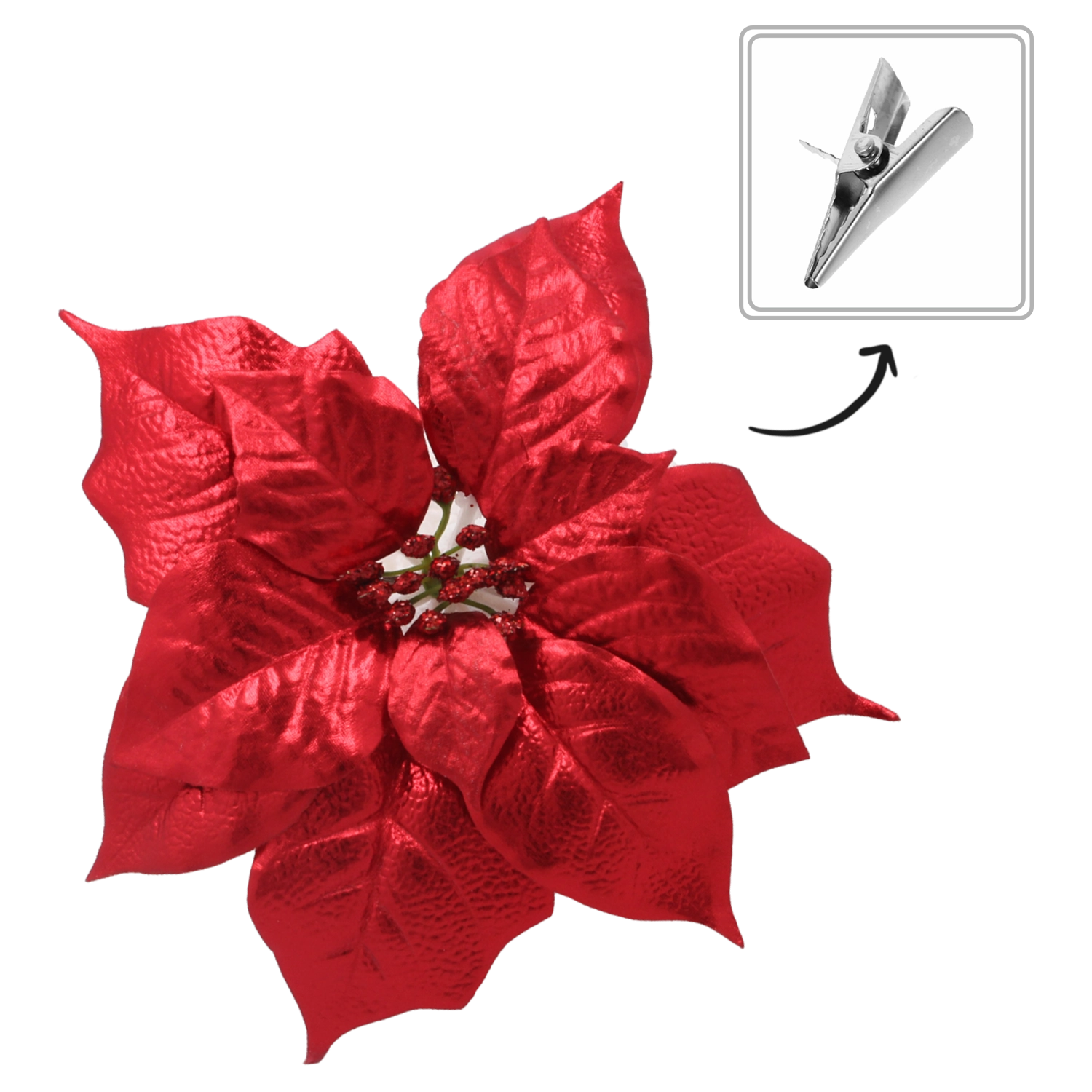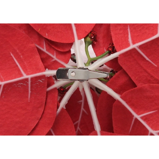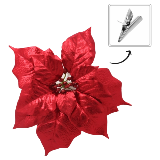 Élégante étoile de Noël (poinsettia) artificielle de 25 cm de diamètre en rouge intense qui apporte à votre intérieur une ambiance festive. Fabriquée en matériau de haute qualité et résistant avec de fines décorations pailletées et une pince pratique pour une fixation rapide et stable sur sapins, couronnes ou guirlandes. Le lot comprend 12 pièces pour une décoration homogène et spectaculaire.