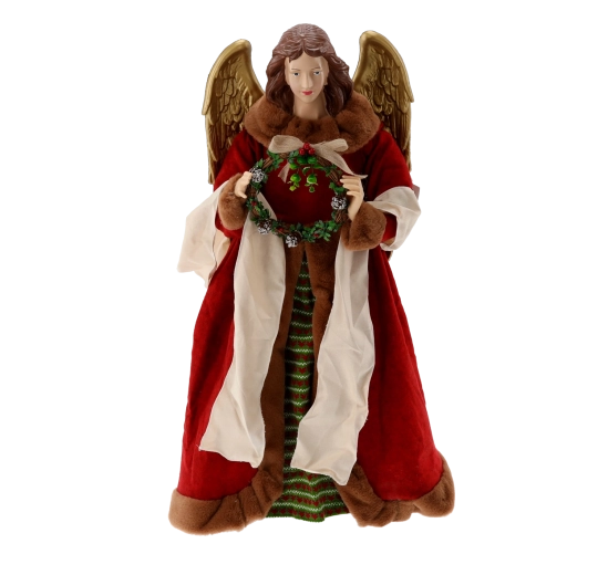 Manteau textile rouge avec fourrure blanche et brune, jupe rayée verte et ailes dorées soulignent le caractère festif. Elle tient une couronne de Noël dans ses mains.