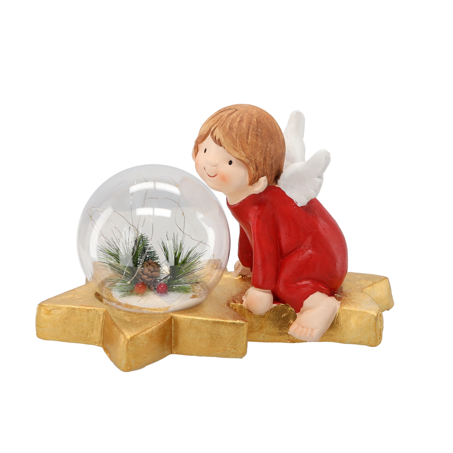 Cette charmante décoration de Noël associe le motif classique de l’ange à un éclairage LED moderne. L’ange en robe rouge et aux ailes blanches est agenouillé sur une étoile dorée stable, tandis que la boule transparente devant lui met en valeur un arrangement naturel d’aiguilles de pin, de baies et d’une pomme de pin. Le résultat est un accent élégant qui illuminera chaque coin festif.