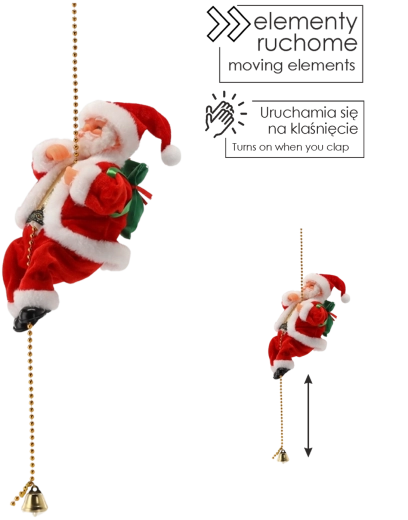 Grâce à la chaîne dorée ornée de petites perles et au grelot à son extrémité, le Père Noël reste spectaculaire même à l’arrêt. Idéal pour compléter une scène de Noël, un sapin ou une déco saisonnière dans une chambre d’enfant. Il constitue aussi une idée cadeau originale pour les amoureux de Noël.
