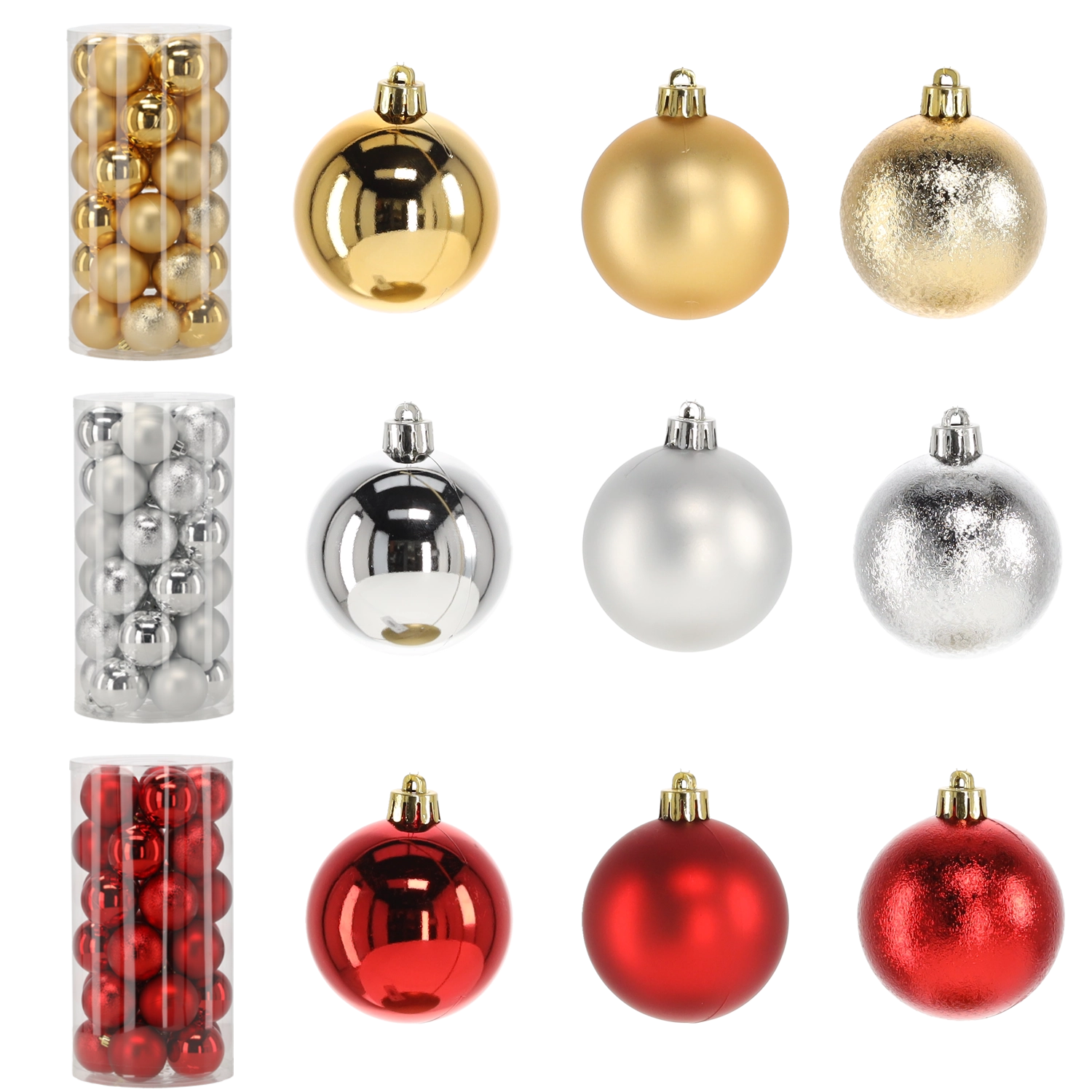 Élégant lot de 30 décorations de Noël d’un diamètre de 6 cm dans une combinaison de couleurs rouge, or et argent, qui donne à votre sapin un aspect traditionnel et festif. Le matériau plastique léger et résistant est sécurisé pour les foyers avec enfants et animaux, tandis que la finition brillante et les motifs et textures variés créent un jeu de lumière enchanteur et un riche effet visuel.