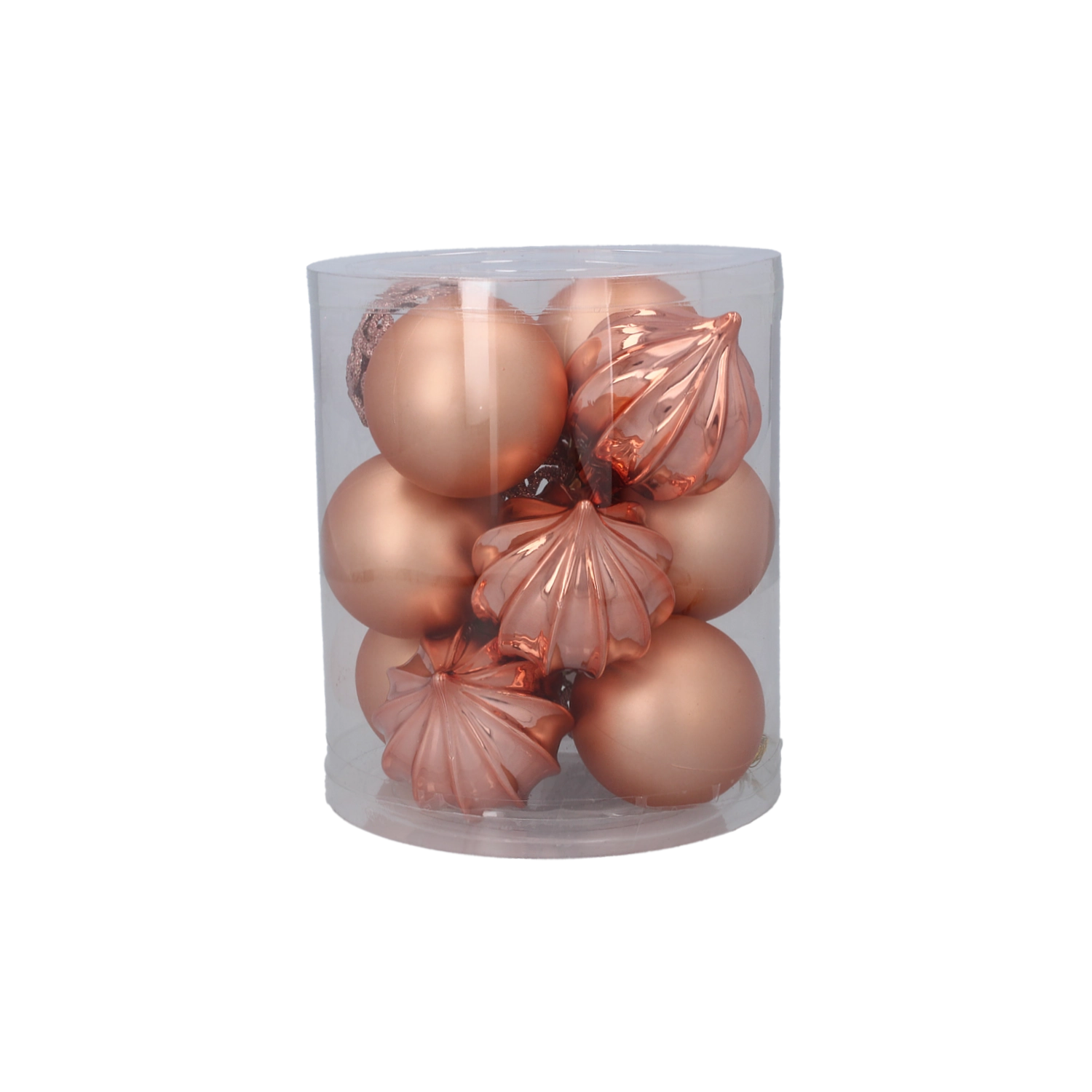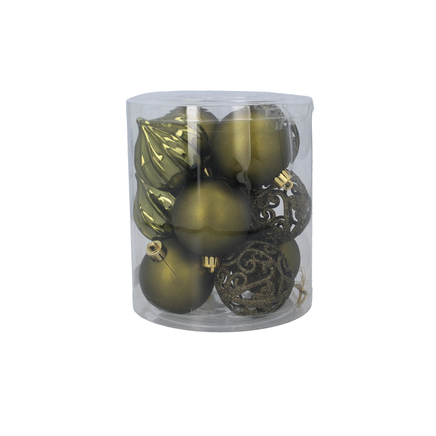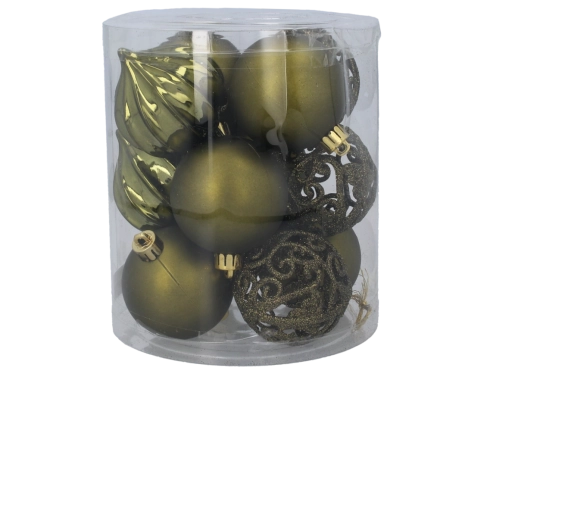 Élégant set de 12 boules de Noël de 6 cm de diamètre en combinaison de couleurs olive, cuivre et graphite, offrant à votre sapin un look moderne et sophistiqué. Les décorations sont en plastique résistant, elles ne se cassent donc pas facilement, et grâce au tube transparent, vous les rangez aisément pendant toute la période des fêtes et hors saison.