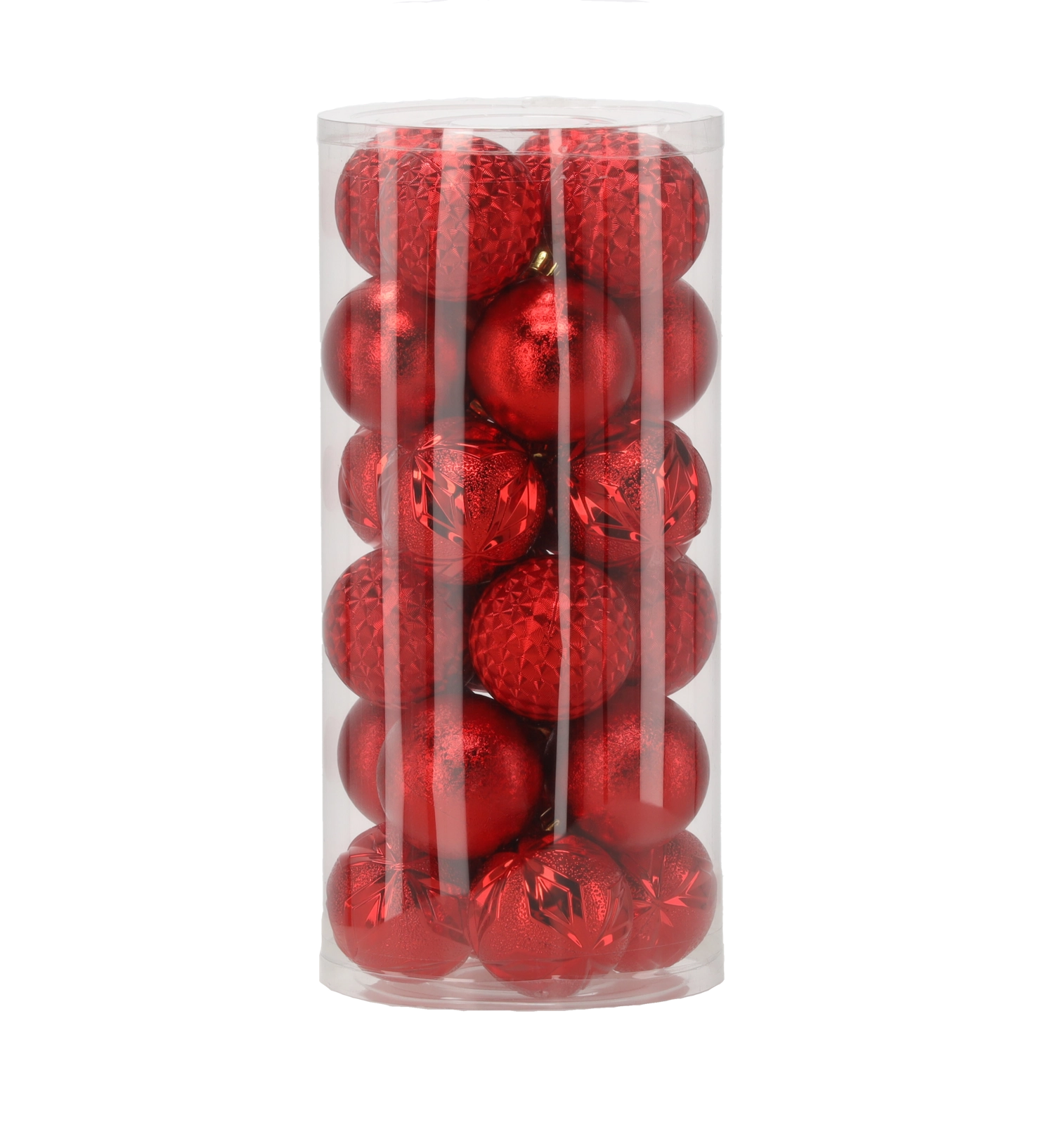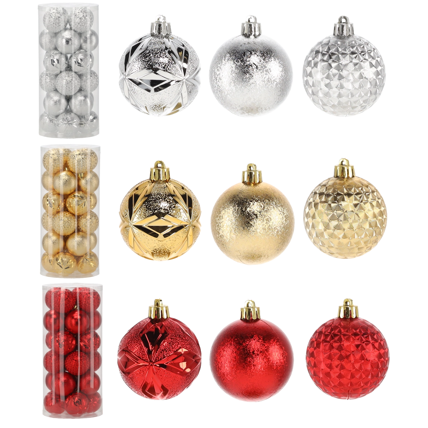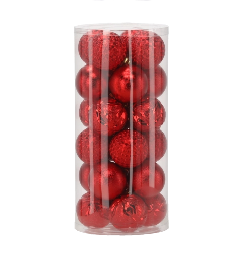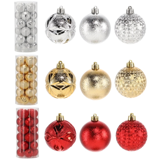 Ce set élégant comprend 24 boules de Noël de 6 cm de diamètre dans une combinaison intemporelle de rouge, doré et argenté. Les différentes finitions de surface telles que brillant, texturé et pailleté donnent de la profondeur et de l’éclat à votre sapin et permettent de créer une décoration harmonieuse.