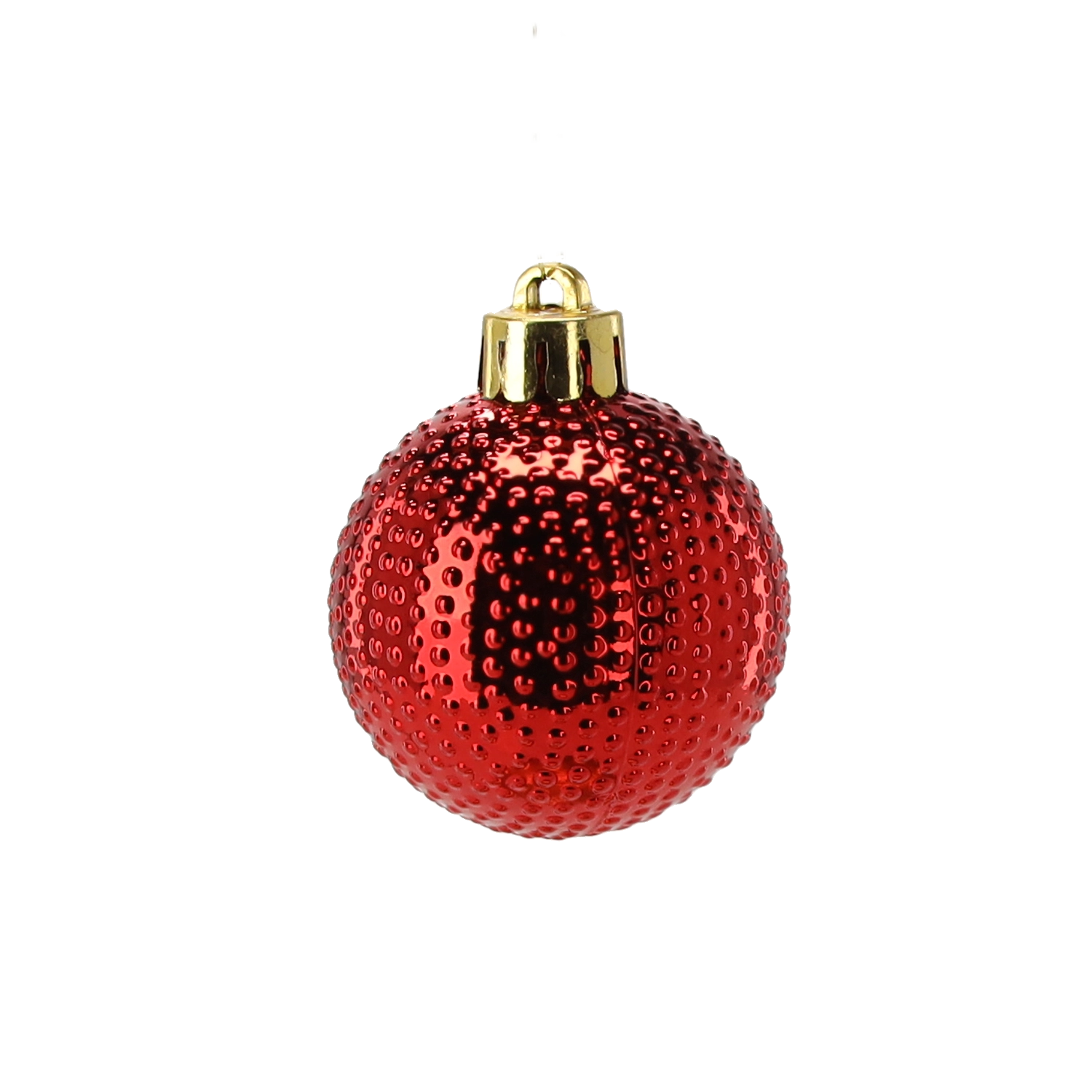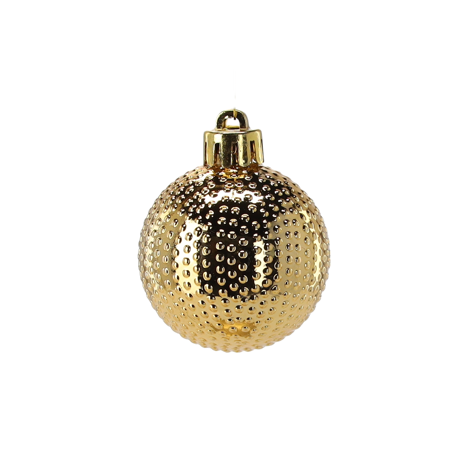 Élégant set de 16 boules de Noël de 4 cm de diamètre, dans une combinaison de couleurs rouge, doré et argenté. Différents finitions brillantes et mates avec des motifs en relief apportent à l’arbre profondeur, éclat et atmosphère festive. Fabriquées en plastique résistant pour une utilisation sûre et durable.