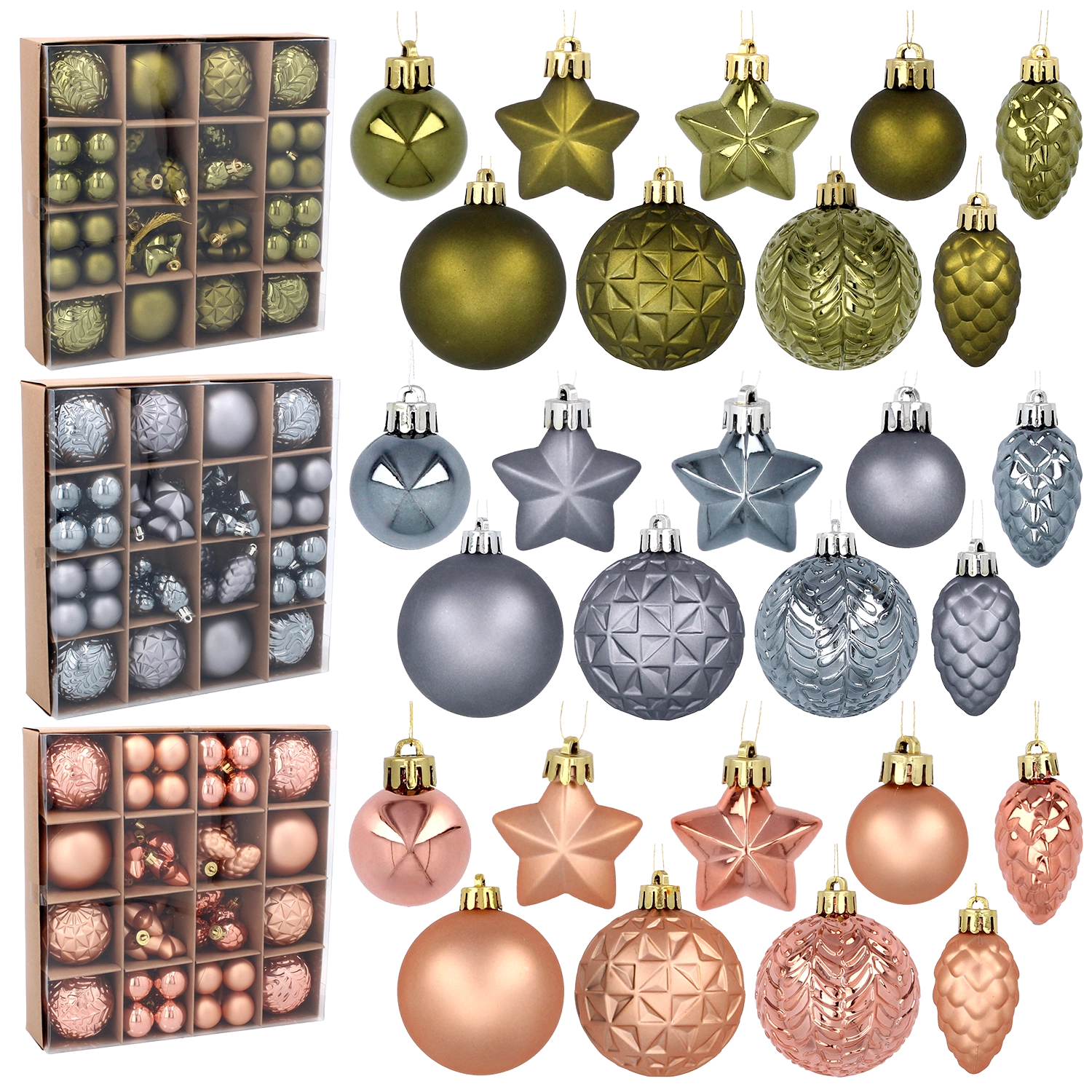 Créez un sapin de fête élégant avec un set de 60 ornements mêlant olive, cuivre et graphite. Un matériau plastique léger et résistant convient parfaitement aux foyers avec enfants et animaux, tandis que les motifs et finitions variés apportent une touche moderne et raffinée à votre intérieur.
