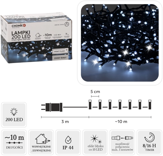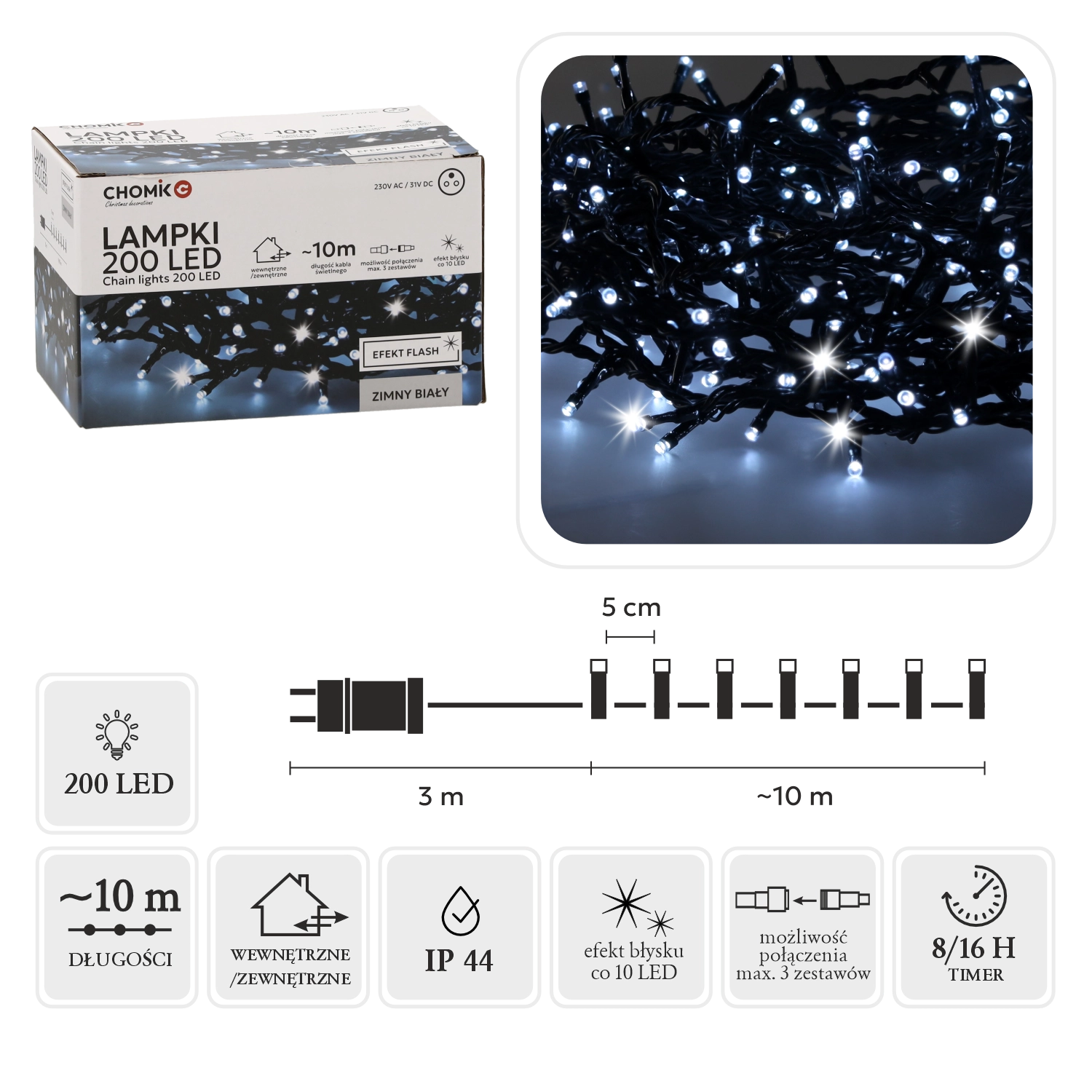 Guirlande lumineuse élégante avec 200 LED en blanc froid et effet flash froid pour illuminer la maison et le jardin. Elle offre 10 m de partie lumineuse + 3 m de câble d’alimentation, un programmeur avec mémoire et minuterie 8/16 h, des modes éclairage fixe + flash et une protection IP44 pour une utilisation sûre en extérieur comme en intérieur.