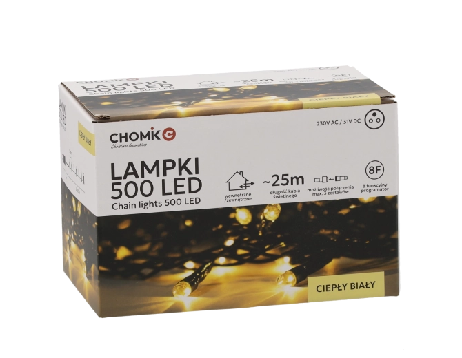 Illuminez votre maison et votre jardin avec une guirlande LED de 25 m comprenant au total 500 LED blanc chaud. Grâce au programmeur avec mémoire, au minuteur 8/16 h et à la possibilité de connecter jusqu’à 3 ensembles, créez facilement une décoration lumineuse impressionnante. Convient à l’intérieur et à l’extérieur (IP44), avec une alimentation sûre de 31 V.