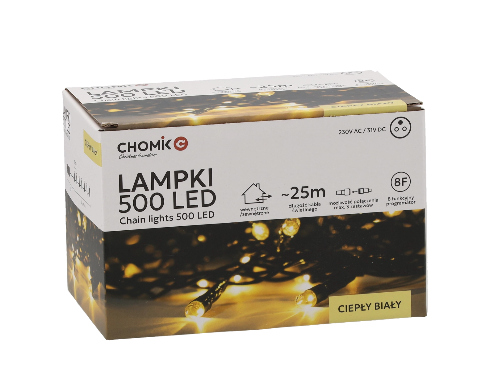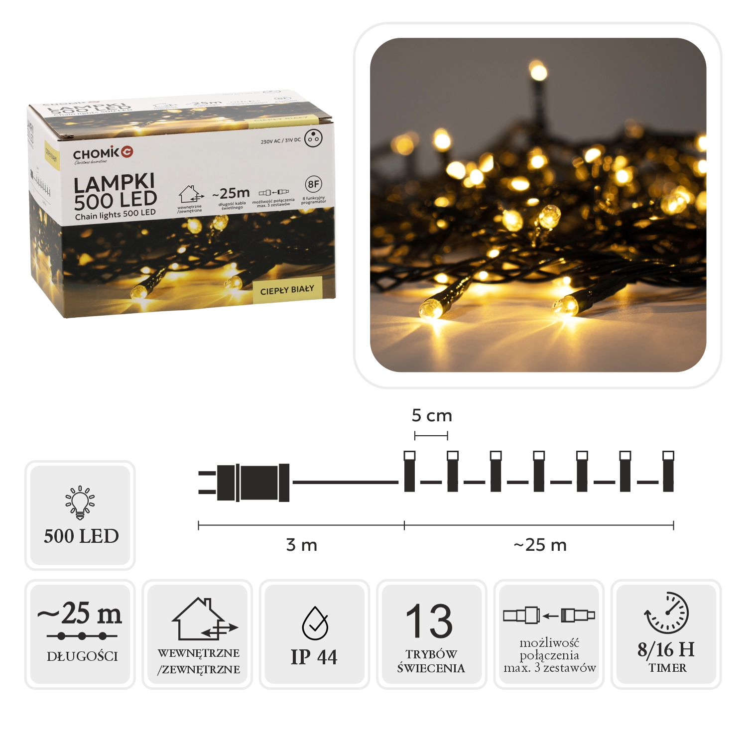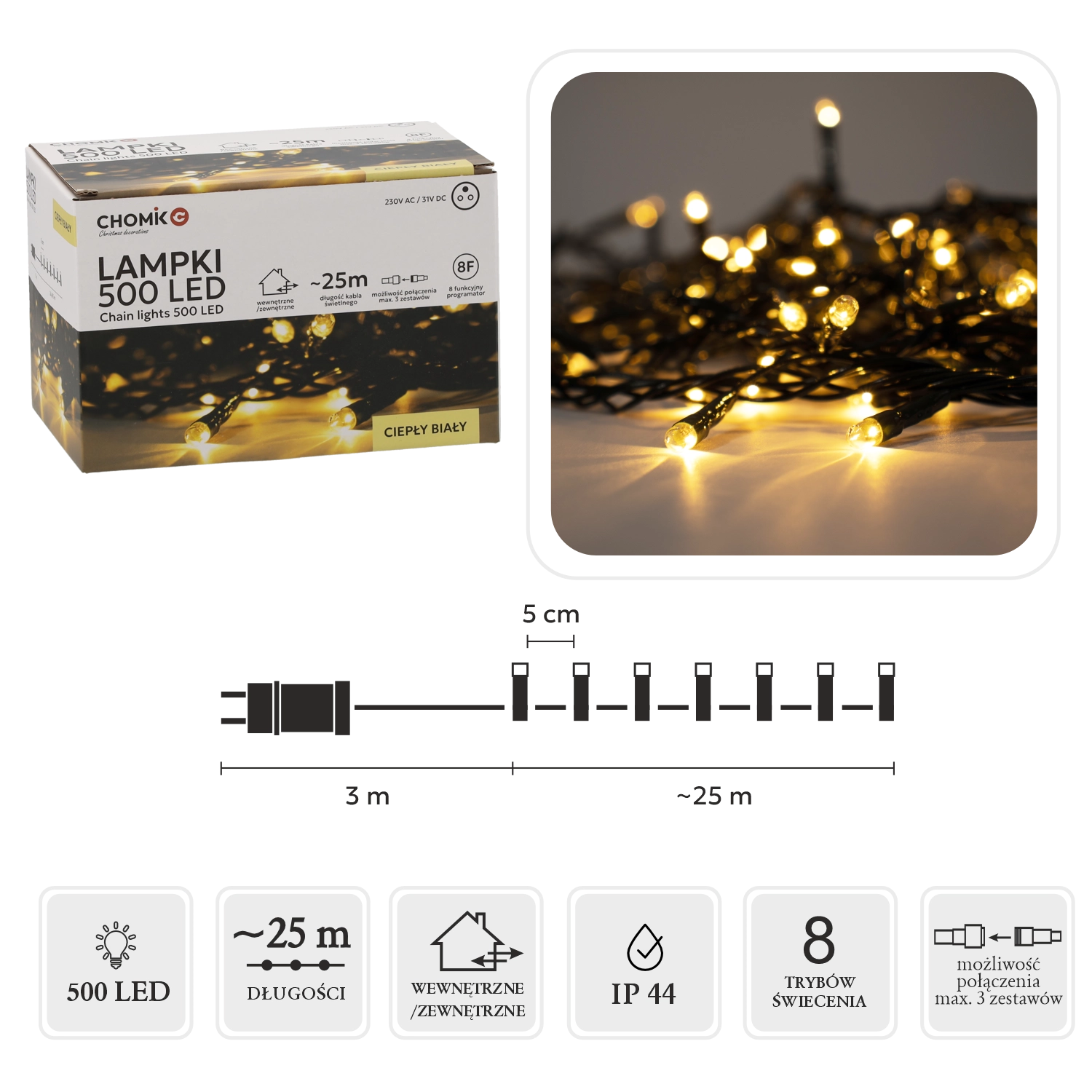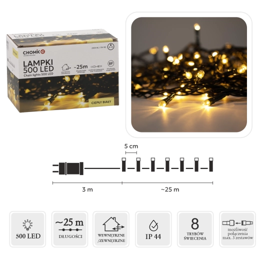 Le programmeur intégré à 8 fonctions, avec mémoire et minuteur 8/16 h, assure une utilisation pratique et la répétition du dernier réglage. La possibilité de connecter jusqu’à 3 ensembles vous permet de créer de longues installations lumineuses captivantes sans compromis. Le degré de protection IP44 et l’alimentation 31 V à basse tension renforcent la sécurité en usage intérieur comme extérieur.