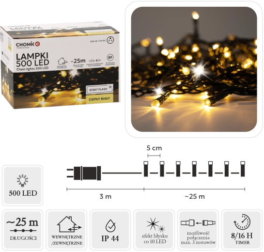 La guirlande est conçue pour une utilisation à l’intérieur comme à l’extérieur (IP44). Le programmateur avec mémoire retient le dernier réglage et la minuterie 8/16 h assure l’allumage et l’extinction automatiques. Grâce à la possibilité de relier jusqu’à 3 guirlandes identiques, vous couvrez facilement des surfaces très étendues.