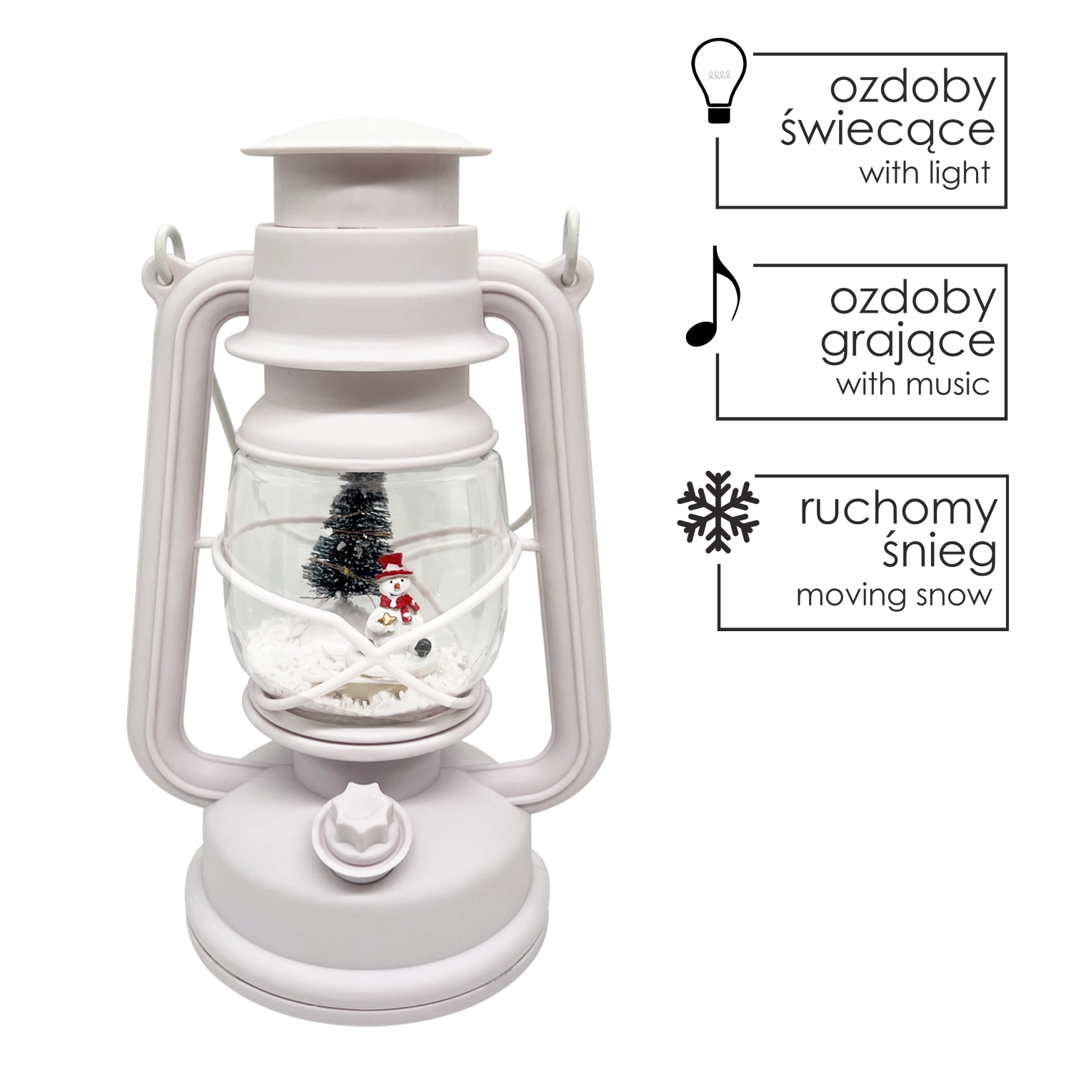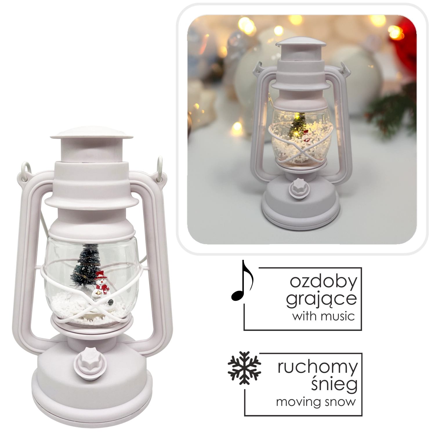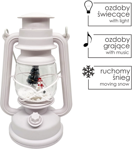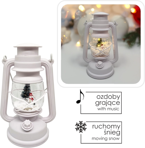 Offrez à votre intérieur une touche de magie de Noël avec la lanterne blanche CHOMIK, qui allie aspect décoratif et fonctionnalités pratiques. L’éclairage LED intégré assure une lumière douce et économe, tandis que la boîte à musique souligne l’ambiance des fêtes par une mélodie agréable. Le motif d’un adorable bonhomme de neige avec son sapin ravira petits et grands.