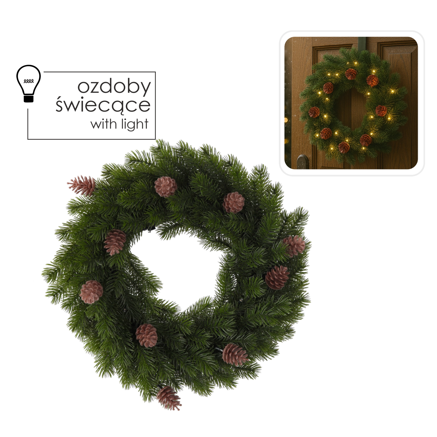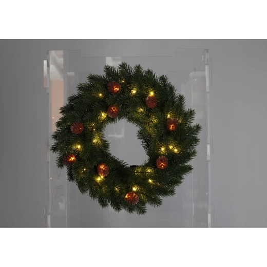 Apportez une touche de magie festive avec cette couronne verte et dense qui illumine la porte d’entrée, les fenêtres et l’intérieur. Grâce à 40 LED en blanc chaud, l’éclairage est agréable, tandis que les pommes de pin naturelles offrent un rendu authentique.