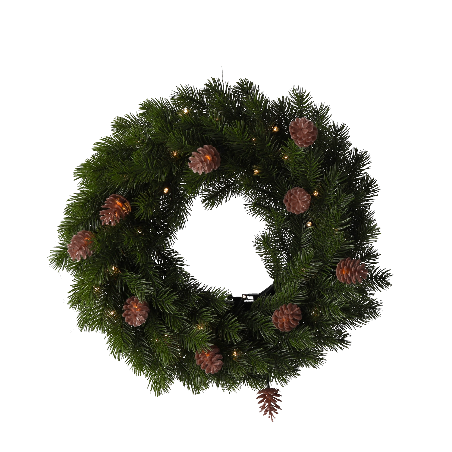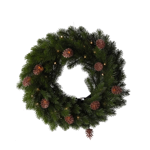 Quarante LED blanc chaud éclairent uniformément les aiguilles denses et les pommes de pin naturelles pour une décoration festive authentique.