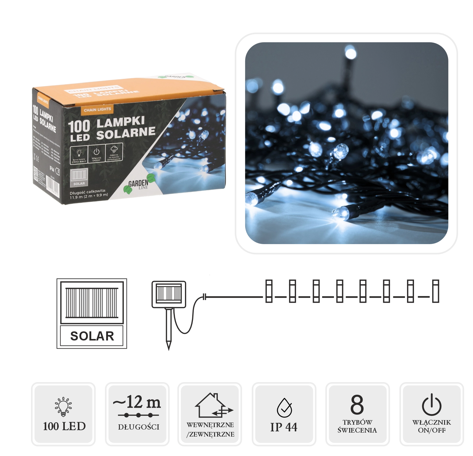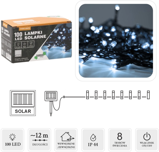 Guirlande lumineuse LED solaire avec 100 LED blanc froid sans besoin de branchement électrique. Longueur de la partie illuminée 10 m, alimentation 2 m, total 12 m. Programmateur avec 8 fonctions, indice IP44 pour une utilisation en extérieur et fonctionnement économe grâce au panneau solaire. Le câble vert se fond parfaitement dans les arbustes, la clôture ou la pergola.