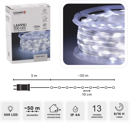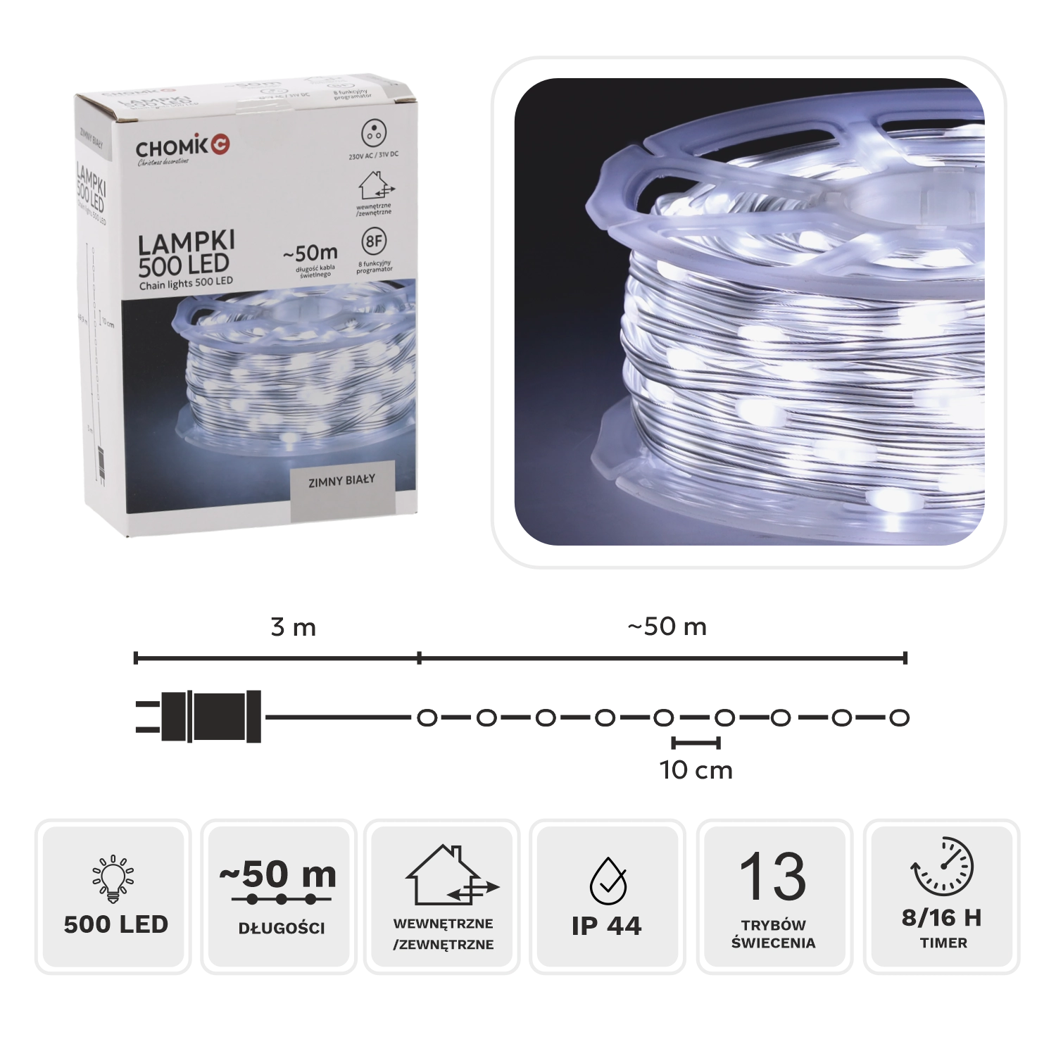 Illuminez votre intérieur ou extérieur avec cette guirlande micro LED de 50 m en blanc froid, dotée de 500 LED. Elle propose 8 modes lumineux avec mémoire du programme et minuterie 8/16 h, IP44 pour une utilisation extérieure et intérieure, une isolation transparente et une alimentation sûre 31 V avec câble d’alimentation de 3 m.