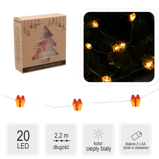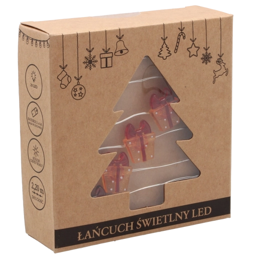 Illuminez votre intérieur d’une ambiance de Noël avec une guirlande lumineuse au motif de cadeaux. 20 LED blanc chaud créent une lumière d’ambiance chaleureuse, et l’alimentation à piles permet de décorer partout – sur le sapin, à la fenêtre, sur une étagère ou dans une couronne.