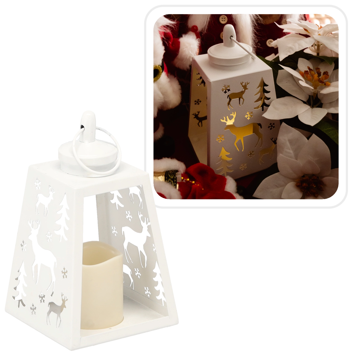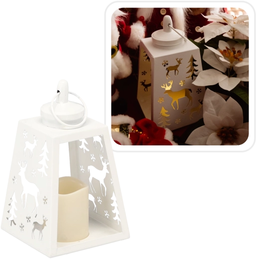 Élégante lanterne LED en métal avec motif de renne, apportant chez vous une lumière blanc chaud et chaleureuse. Elle inclut une bougie en plastique à effet réaliste, alimentée par 2× piles AAA (non incluses). Grâce à ses dimensions compactes de 12 × 21,5 cm, elle convient parfaitement à une étagère, une table ou un rebord de fenêtre. L’indice de protection IP20 est destiné à une utilisation en intérieur.