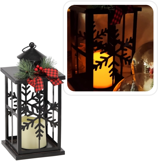 Lanterne de Noël en métal LED avec flocons de neige, noire 31,5 cm