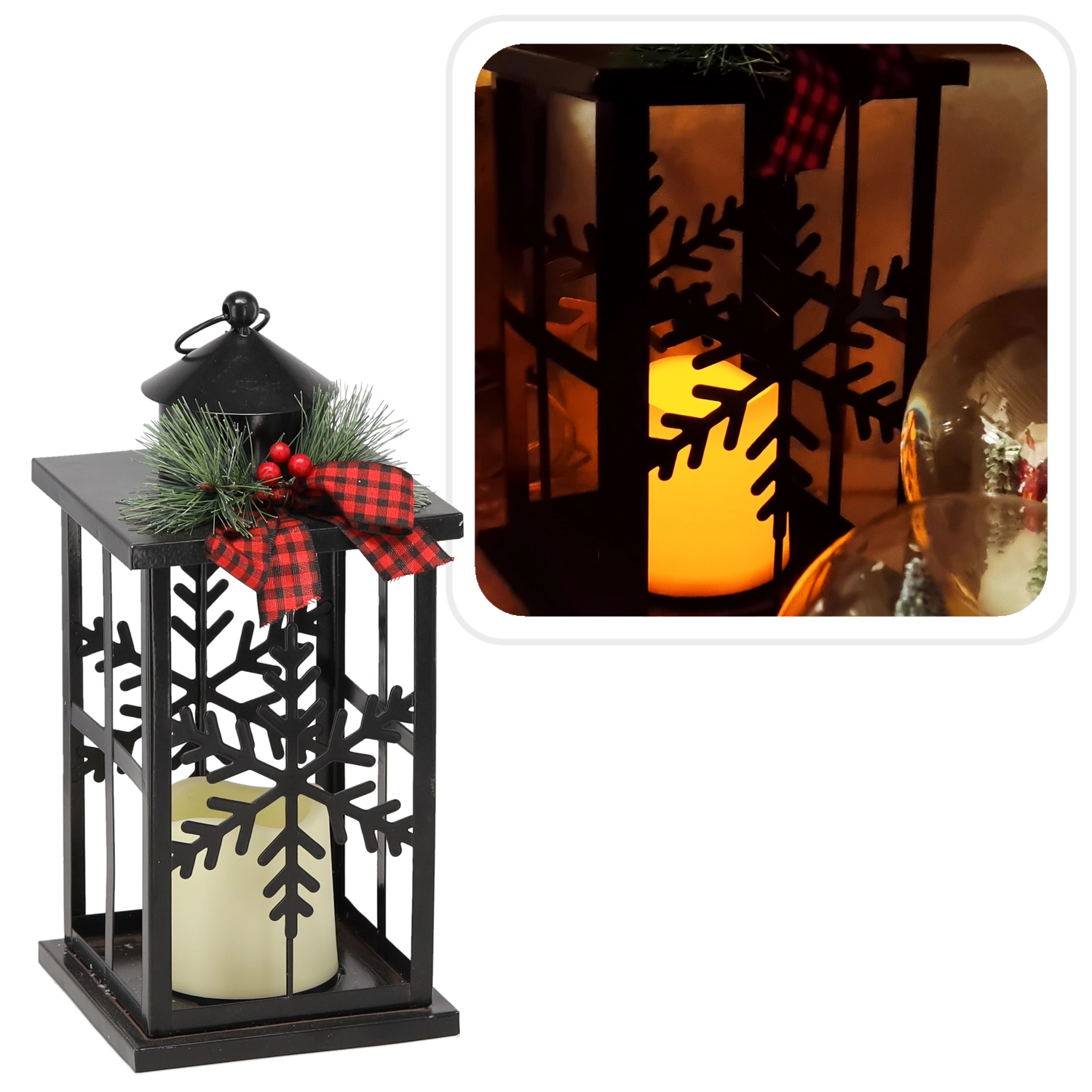 Apportez de la magie à vos fêtes avec cette lanterne LED en métal au noir intemporel. Grâce aux découpes en forme de flocons de neige, elle crée de superbes effets lumineux et une agréable ambiance hivernale. La « bougie » LED à l’intérieur assure un éclairage sûr et sans entretien, sans fumée ni dégagement de chaleur.