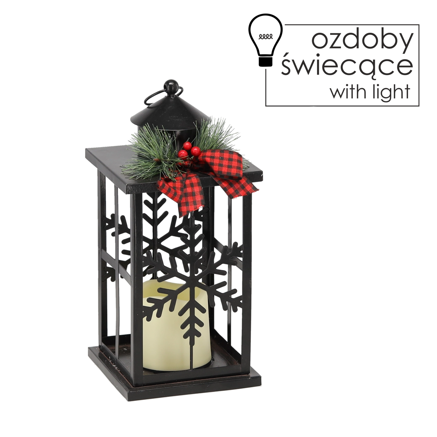 Élégante lanterne de Noël en métal noir qui apporte à votre intérieur une lumière chaleureuse et une ambiance festive. La décoration est ornée de délicats motifs de flocons de neige, d’un ruban stylé et d’un éclairage LED chaleureux, sûr et économique. Idéale comme décoration pour la table, la commode ou l’appui de fenêtre.