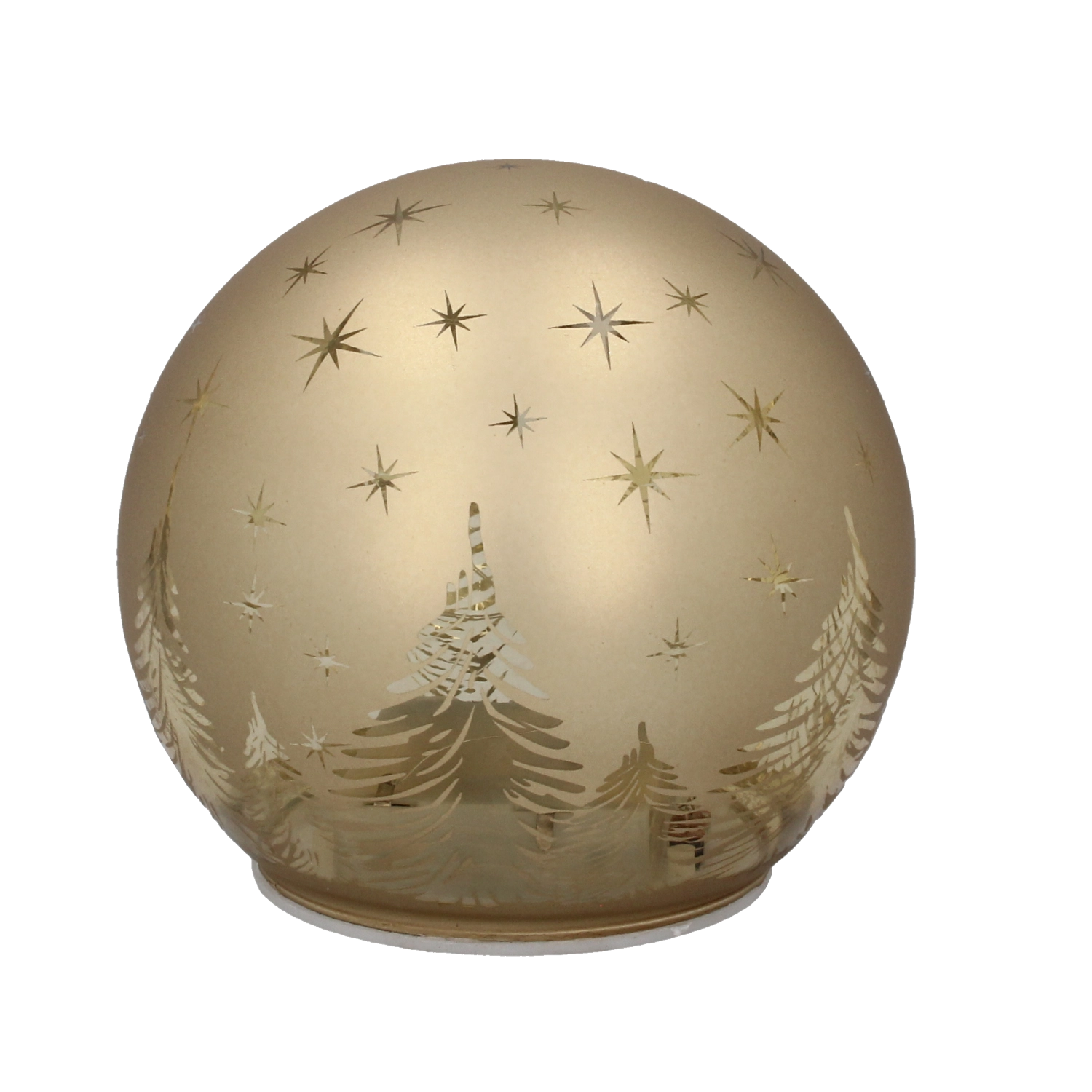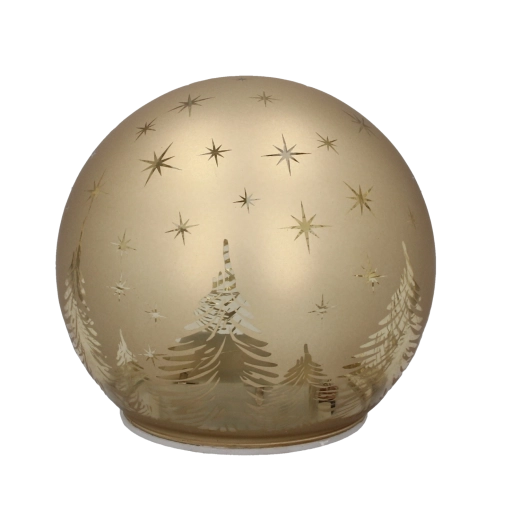 Élégante sphère en verre au fini doré luxueux avec éclairage LED intégré, elle apporte à votre intérieur une ambiance chaleureuse et festive. Une lumière douce à effet ciel étoilé crée une atmosphère cosy, tandis que les LED à faible consommation garantissent une longue durée d’utilisation sans gaspillage d’énergie. Ses dimensions compactes de 12 × 11 cm permettent une installation aisée sur une table, une étagère ou un rebord de fenêtre.