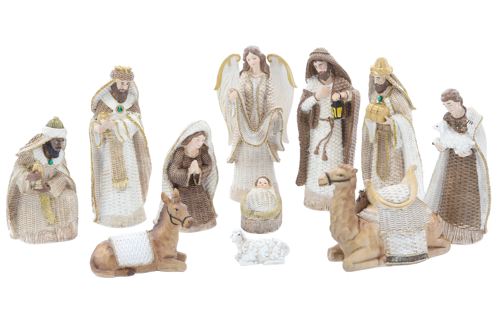 - Ensemble complet de 11 pièces – l’Enfant Jésus, Marie, Joseph, les trois rois, un ange, un berger, un âne, un mouton et une vache.