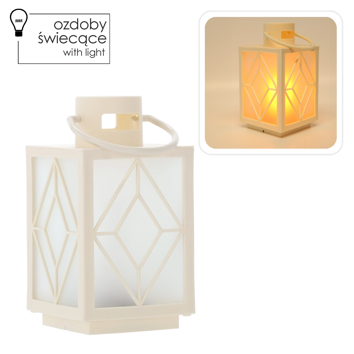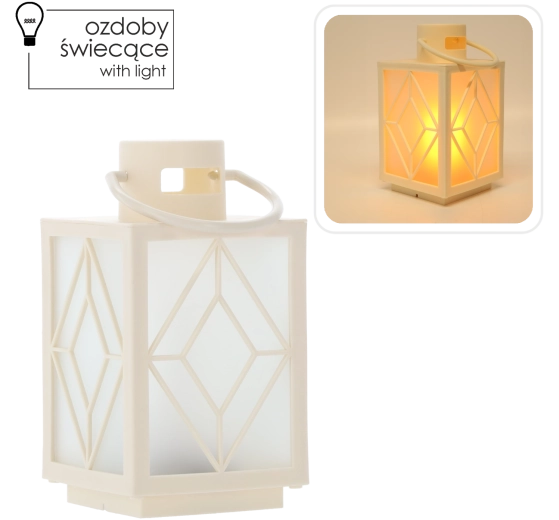 Élégant lampion de Noël blanc avec éclairage LED intégré, créant une atmosphère chaleureuse à l’intérieur comme à l’extérieur. Dimensions compactes 11 × 11 × 20,5 cm et anse de suspension pratique pour une installation facile sur une table, un rebord de fenêtre ou accroché à un crochet. Alimentation par 3× piles AAA (non incluses) pour un fonctionnement sûr sans câble ni flamme.